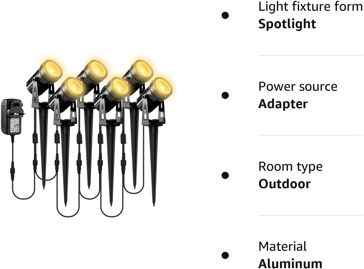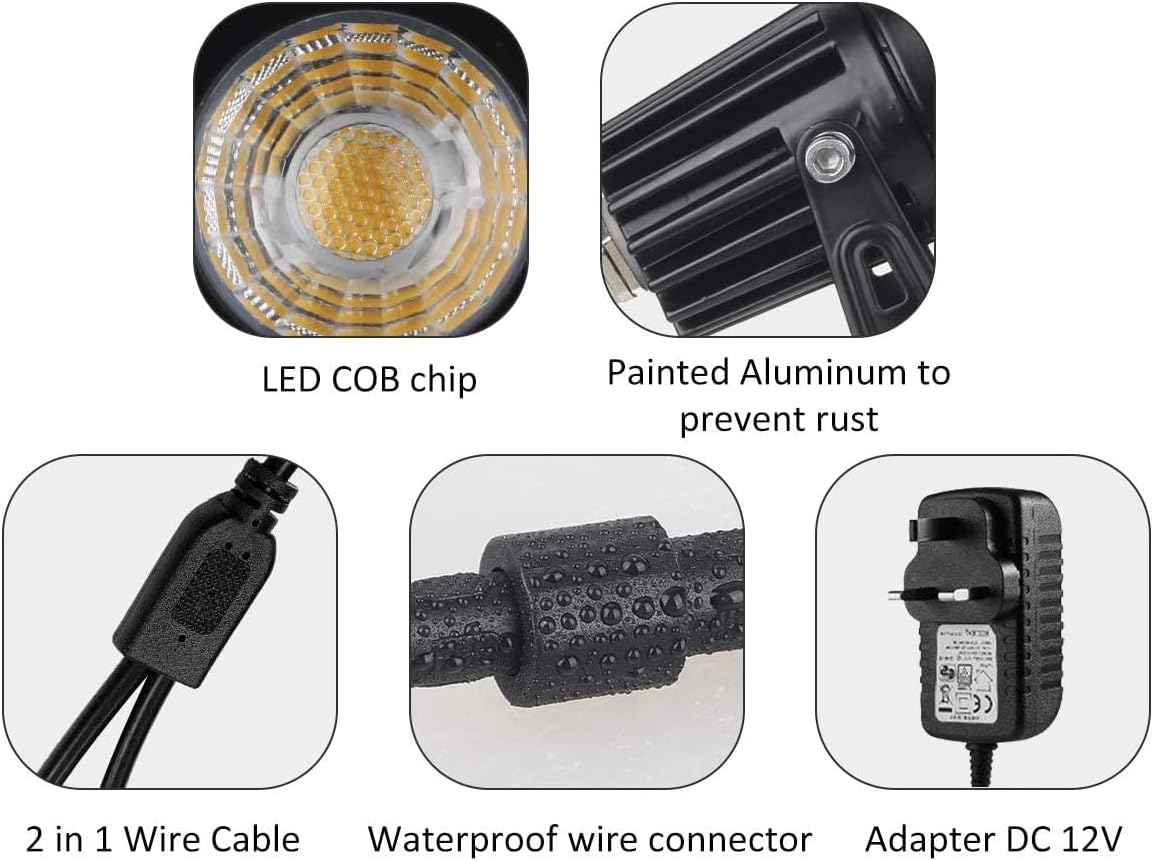 【6 in 1 Landscape LED Lighting with Plug】The garden mains powered spotlights come with an adapter, no need transformer, 12V safe working voltage compatible with low voltage landscape lighting system, use the premium COB LED chips, safer than regular high voltage lighting, no need to worry about overheating or burning.