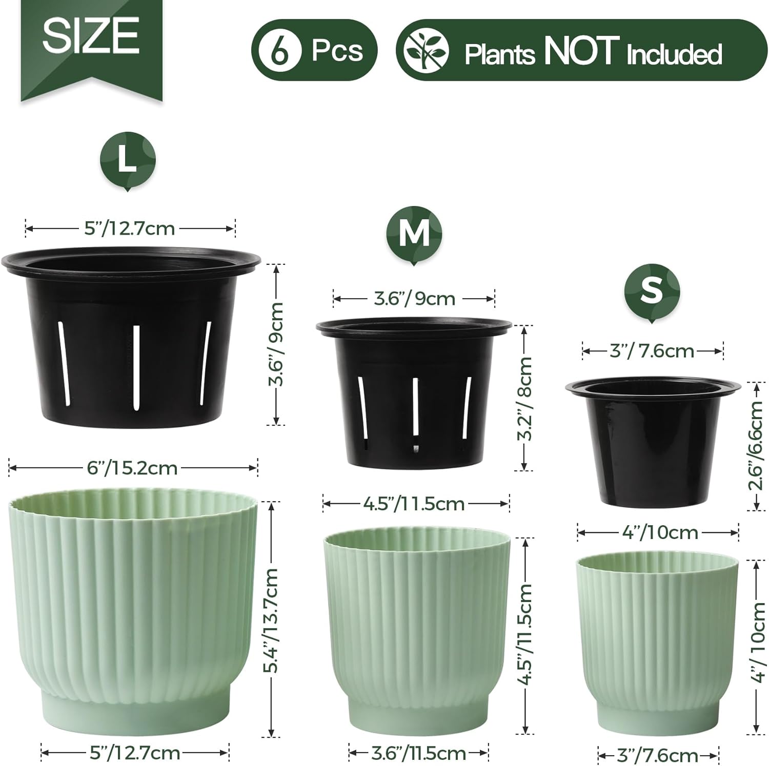 T4U 4 Inch Self Watering Pots 6 Pack, Plastic Plant Pots with Holder, Windowsill Flowers Pots for All Indoor Outdoor Plants, African Violets (Green)