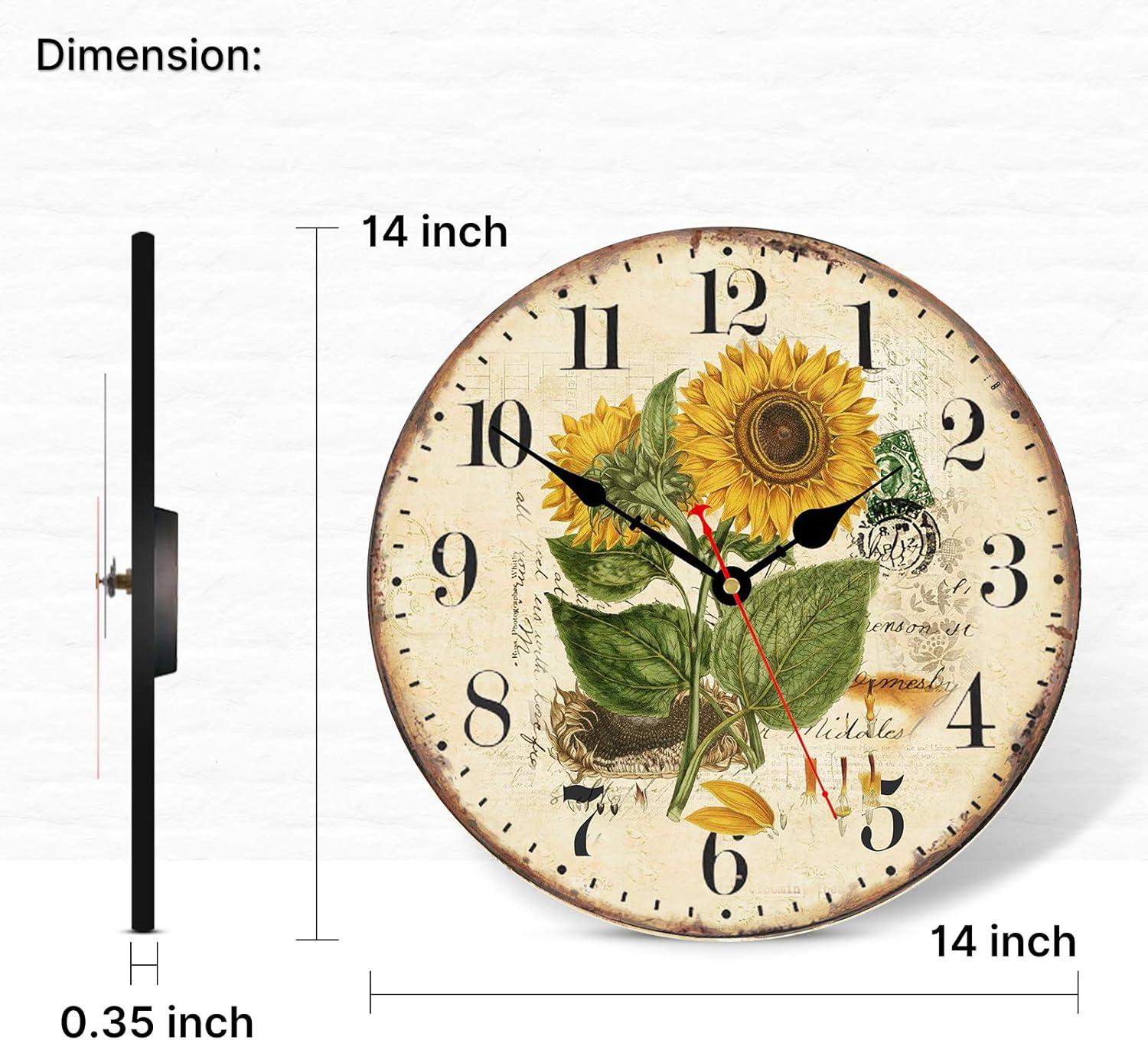 TAHEAT 14 Inch Beautiful Sunflower Wall Clock, Vintage Country Floral Silent Non ticking Clocks, Wooden Round Easy to Read Wall Clock for Kitchen/Living Room/Bedroom/Bathroom