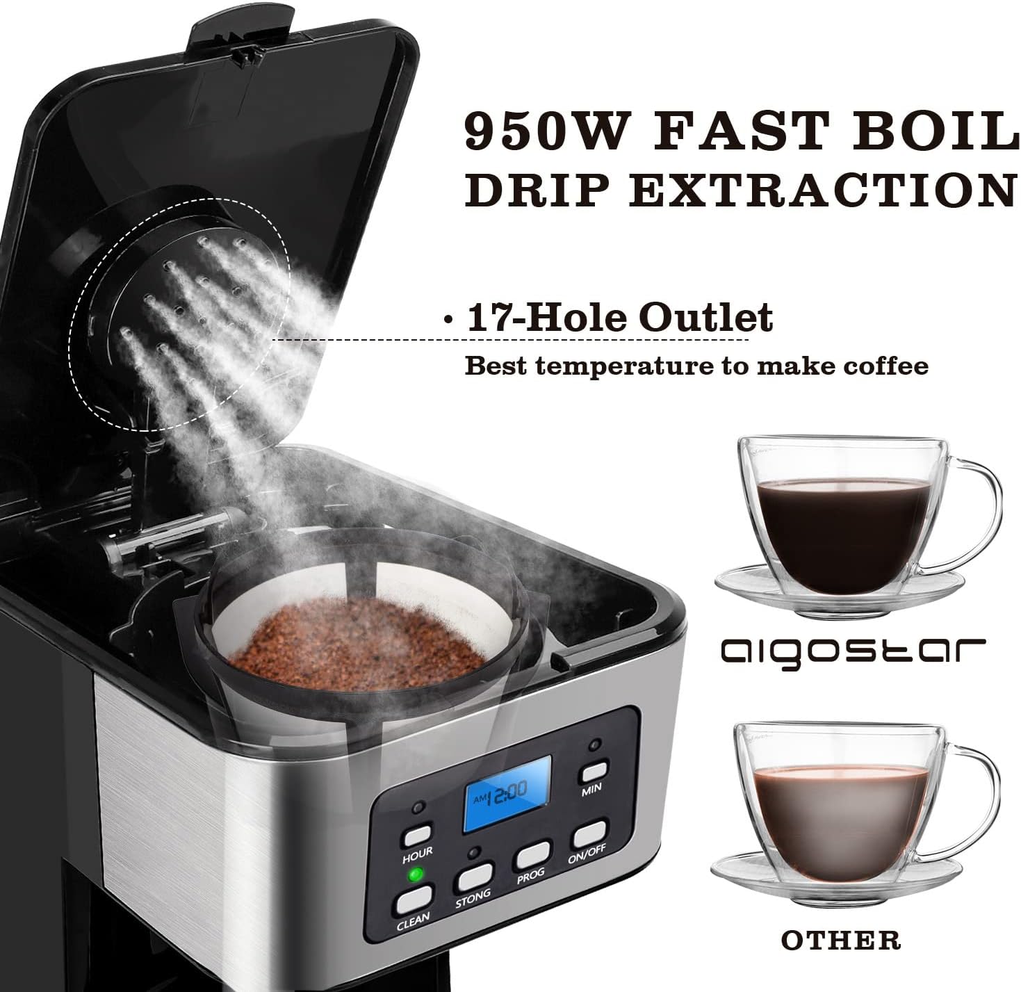 【Better Coffee Taste】 The coffee machine with advanced shower head technology delivers controlled flow and even distribution of water for a fuller flavour and smoother taste. The water is sprayed out over the ground coffee so the whole batch gets the water, not just a spot in the middle, giving you perfect filter coffee every time. And the “strong” button enables you to lengthen the brewing time and thus alter the strength of the coffee. Customize strong or mild coffee as you like.