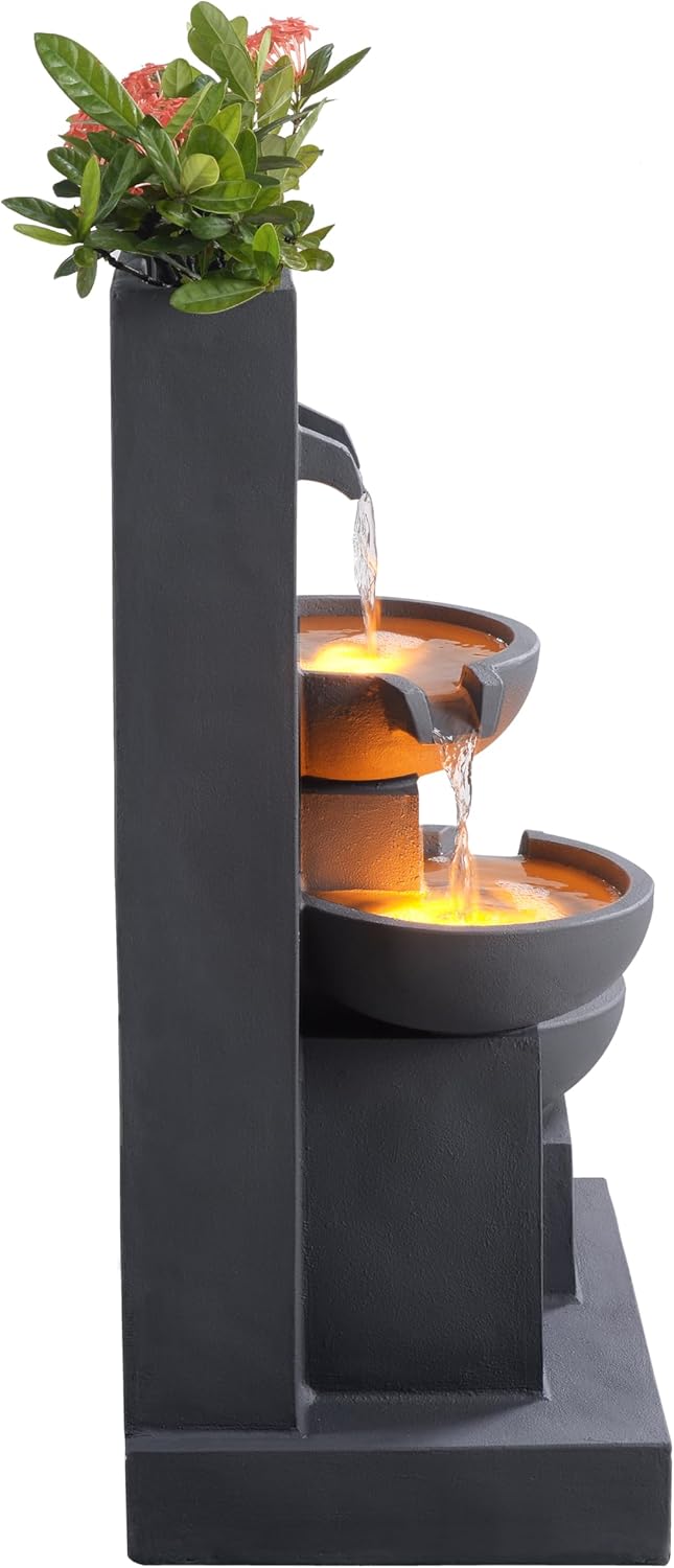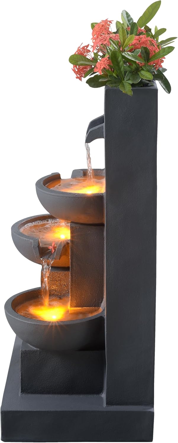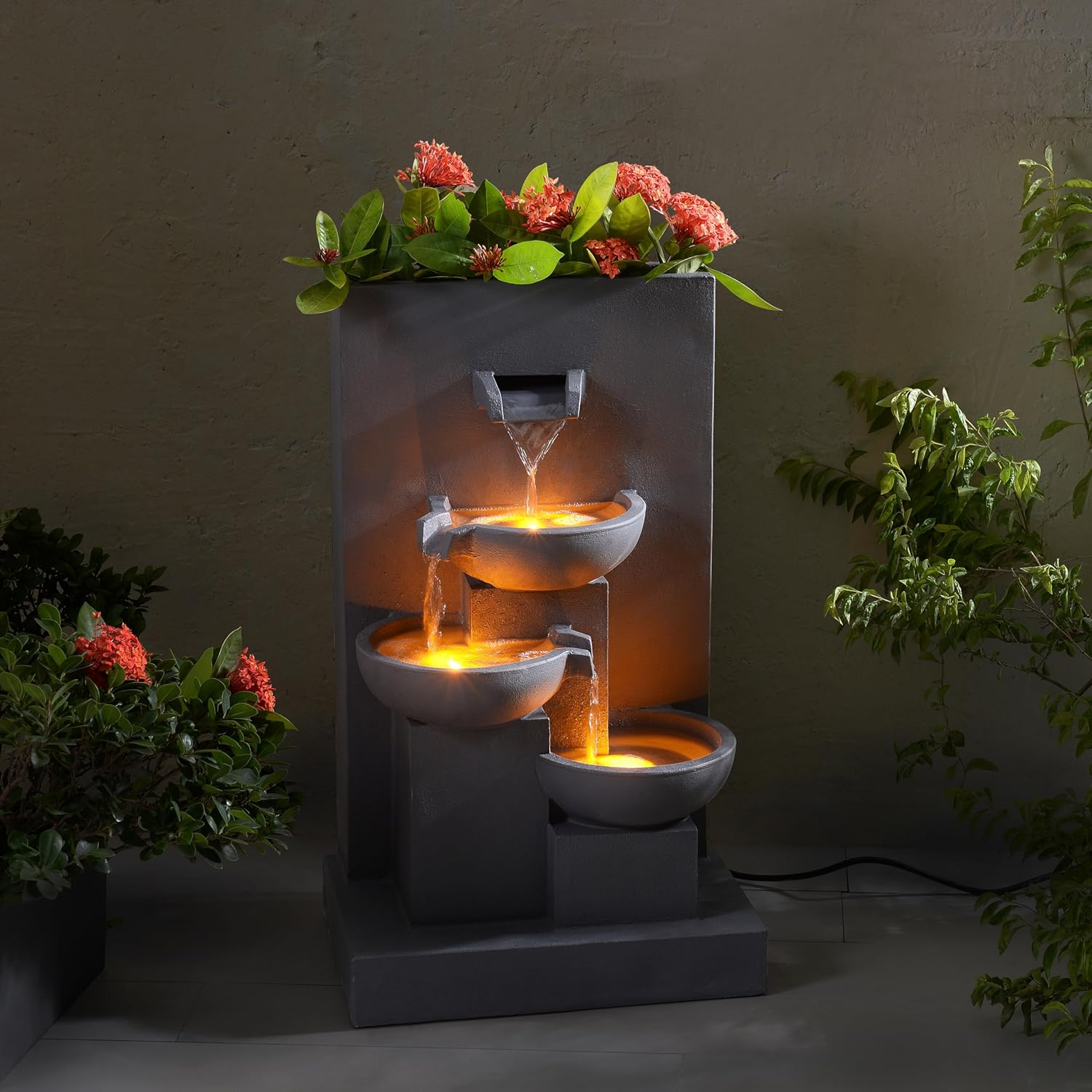Teamson Home 74 cm 3-Tier Cascading Outdoor Water Fountain with Planter, LED Lights for Outdoor Living Spaces, Matte Gray