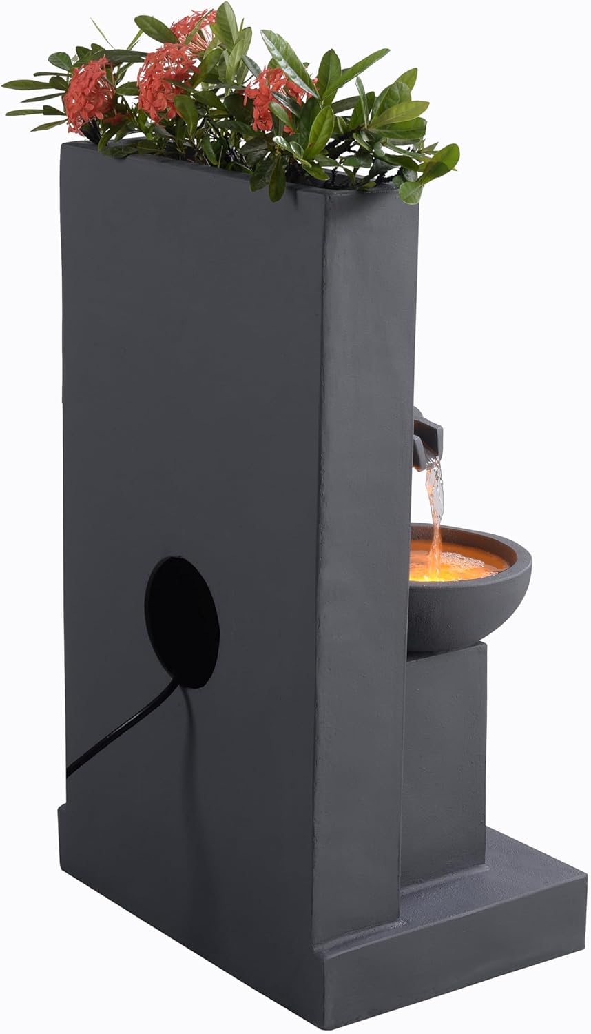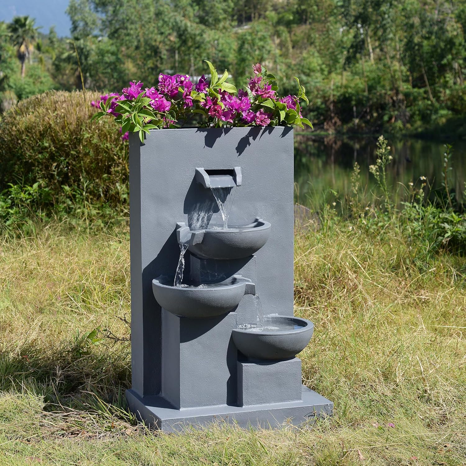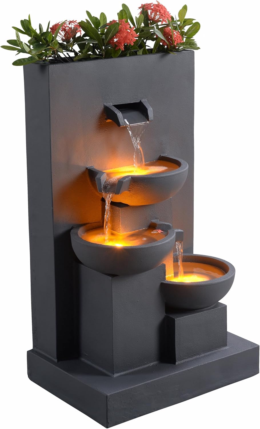 Teamson Home 74 cm 3-Tier Cascading Outdoor Water Fountain with Planter, LED Lights for Outdoor Living Spaces, Matte Gray