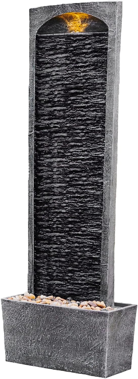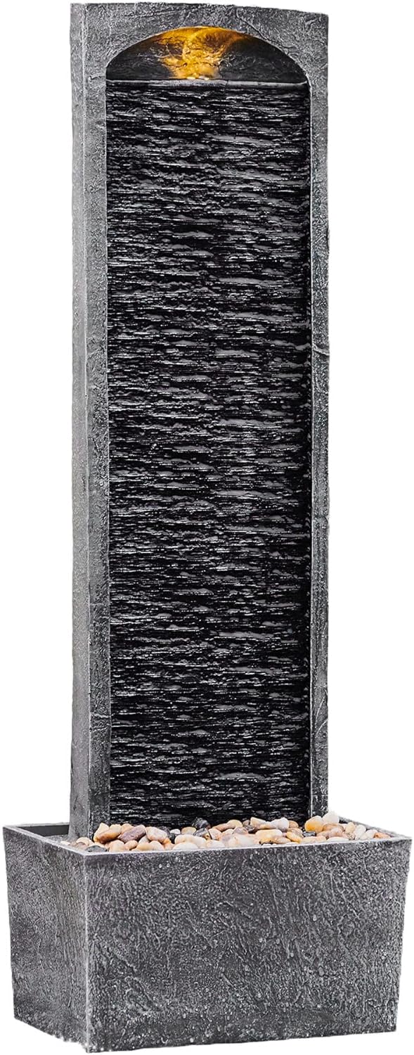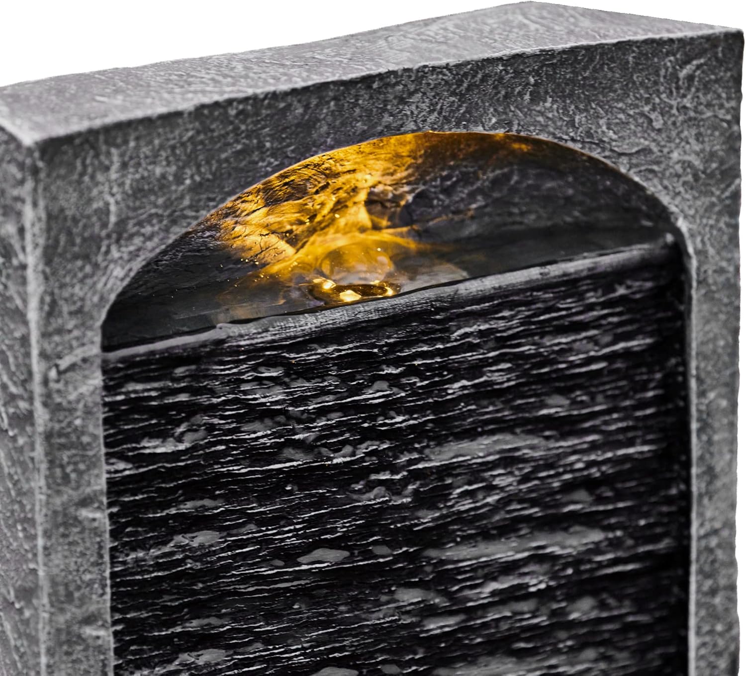 GARDEN WATER FOUNTAIN: Features natural slate effect ledgestone in a contemporary straight shape for a tranquil and soothing addition to your indoor or outdoor space. Water flows from each tier to mimic realistic sounds of a waterfall creating a peaceful and relaxing atmosphere. LED lights keep the fountain illuminated to add a soft glow. Water Capacity: 9 Litres.