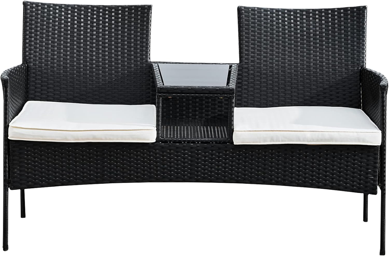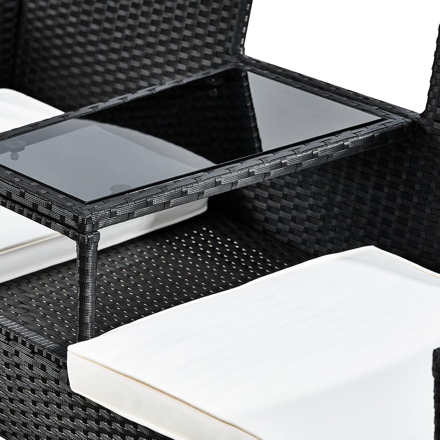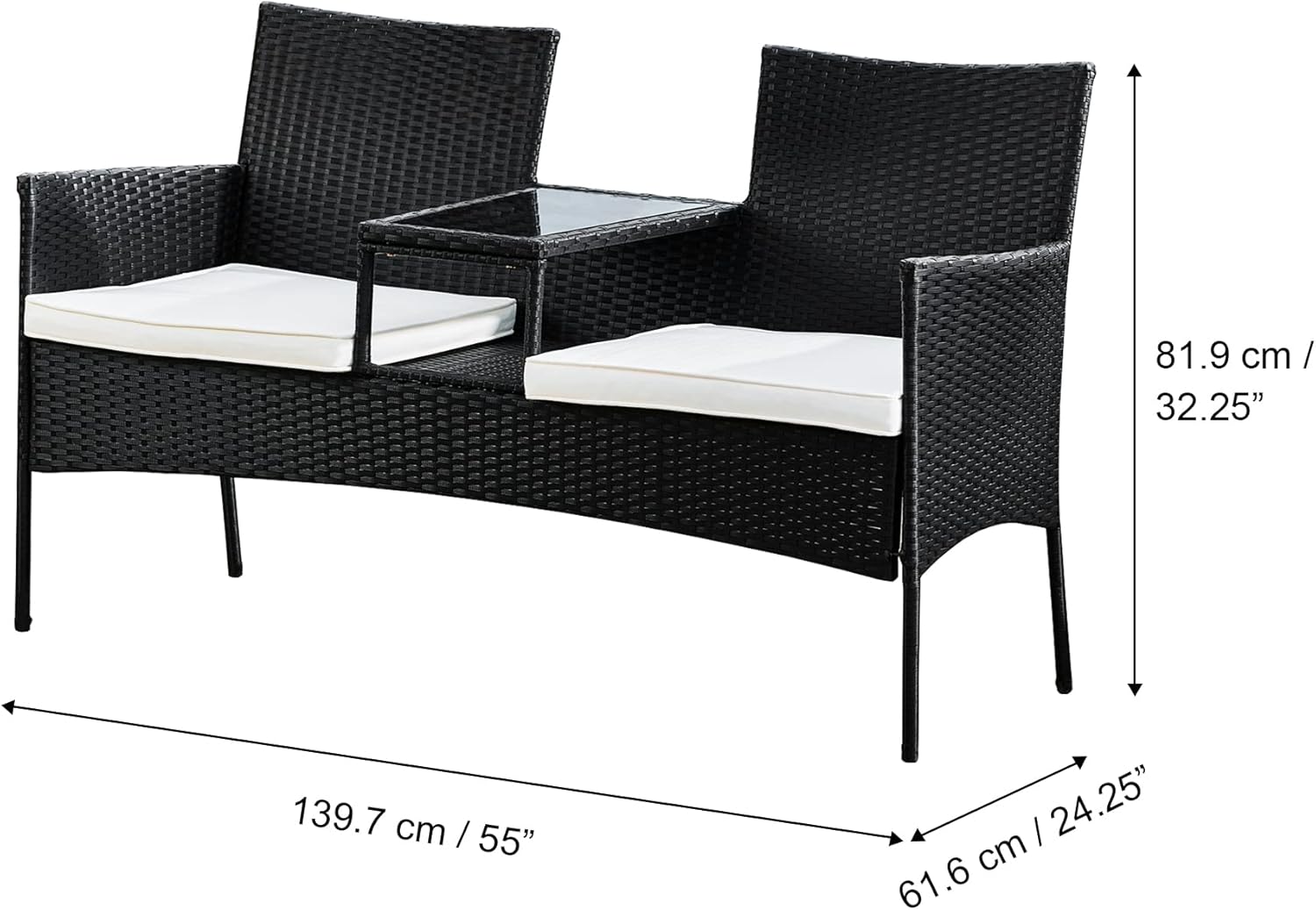 Teamson Home Outdoor Patio Love Seat Bench, 2 Seater Bench with Cushioned Seats, Built-In Centre Glass Table and Shelf, Rattan Wicker Garden Furniture, Black