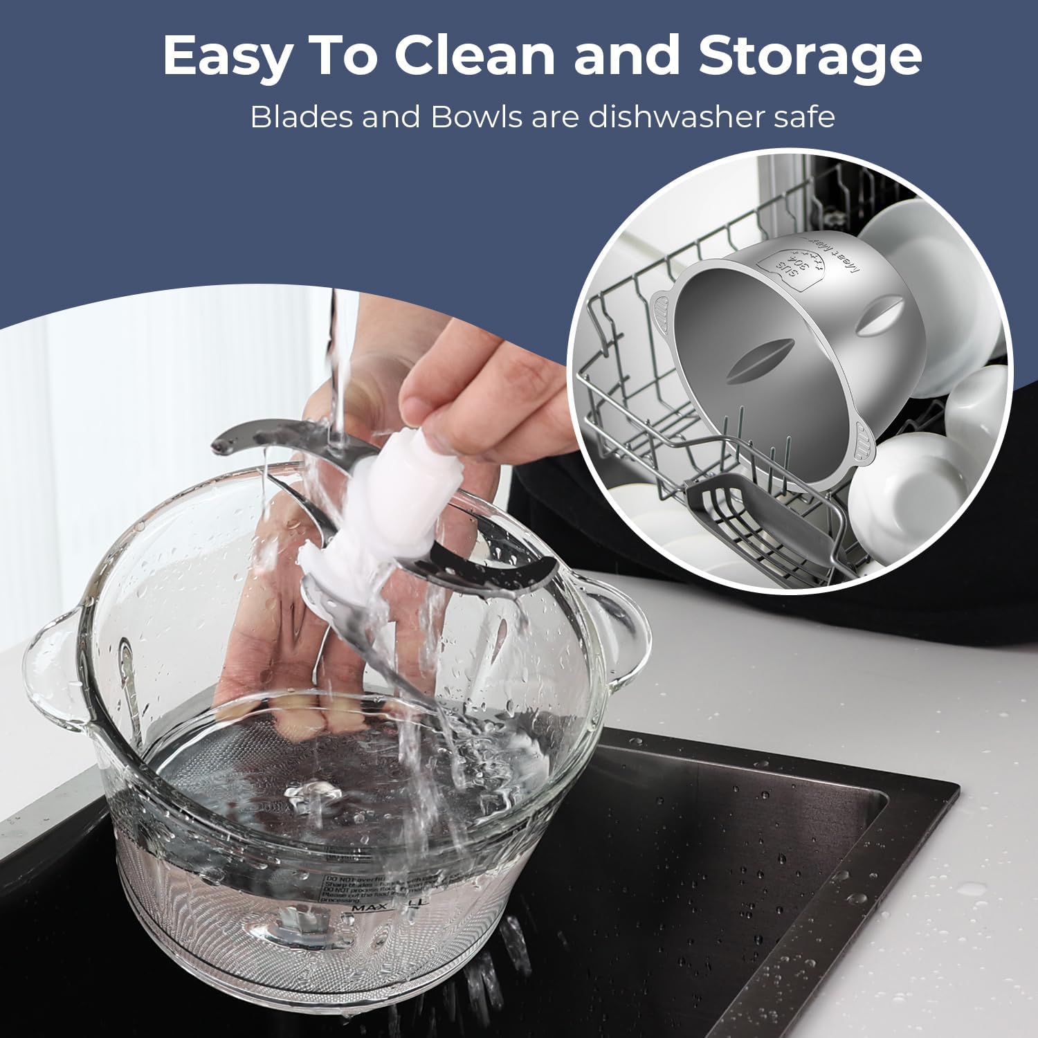 💧【Easy cleaning and storage】The food processor is easy to install, quick to remove and the 2 bowls can be stacked to save space. The parts of the food processor are removable and easy to clean. Bowls, blade,lid all are dishwasher safe. This product does not contain this BPA free, can be safely used in the family use or baby food.