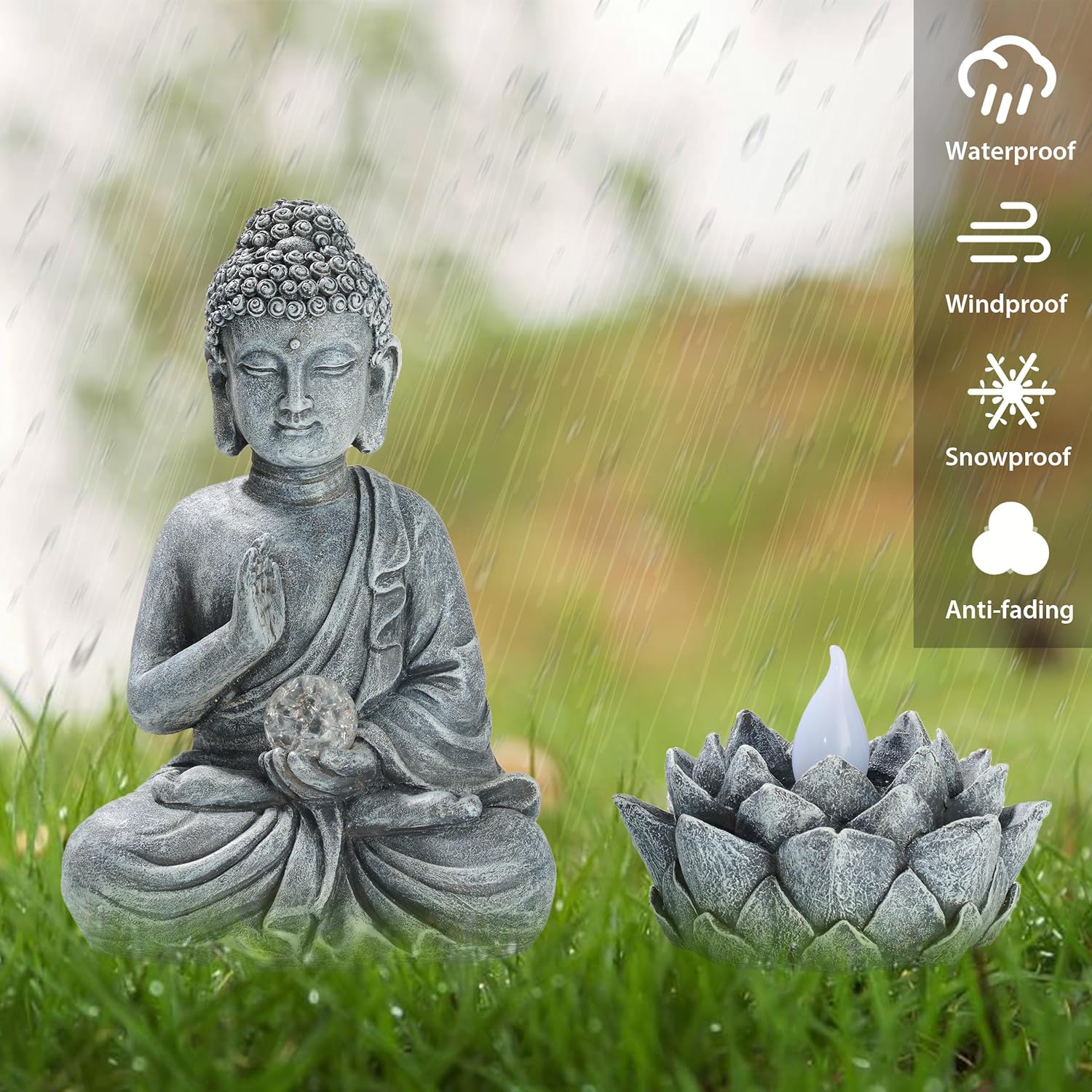 TERESA’S COLLECTIONS Buddha Statue with Lotus Solar Garden Ornament, Set of 2 Meditating Buddha Ornaments Solar Lights Outdoor, Decorations for Garden Yard Patio Balcony, 38CM