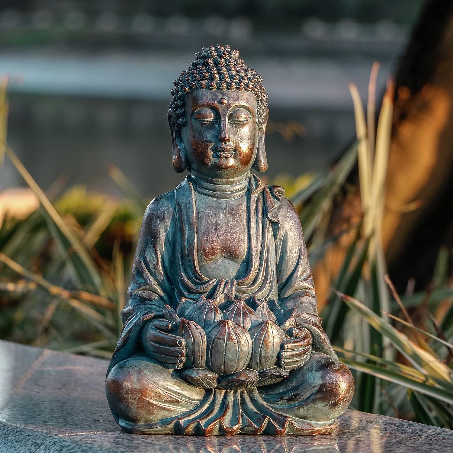 TERESA’S COLLECTIONS Garden Ornaments Outdoor, Bronze Meditating Lotus Buddha Garden Ornaments with Solar Lights, Zen Buddhism Garden Statues and Figurines for Outdoor Garden Gifts, 27.5 cm