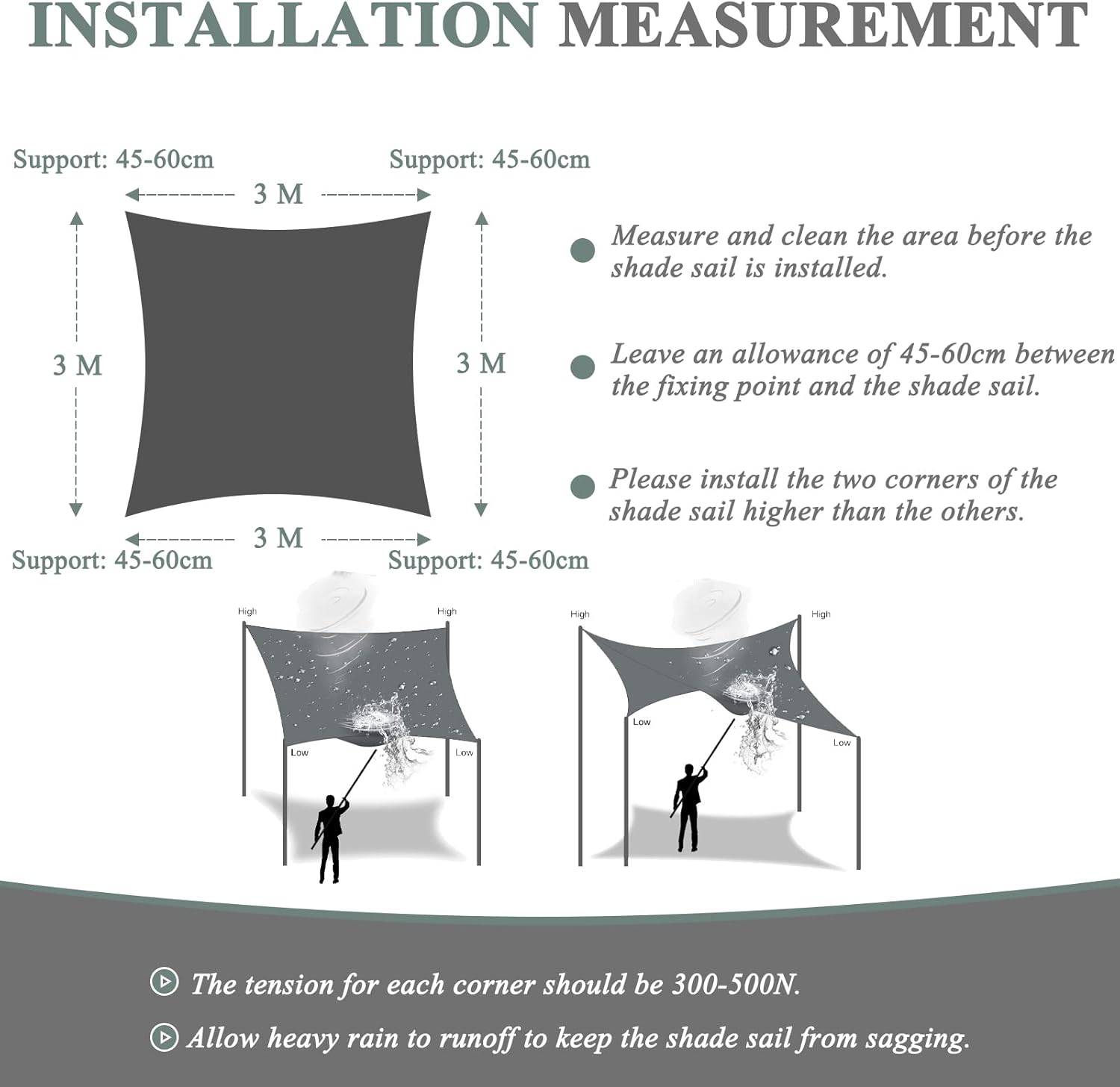 Easy to Install: Find your supports and tight the shade sail to them with ropes by the D-ring, the ropes are included in the bags you received. Install at a 20-40 degree angle with maximum tension to allow runoff.