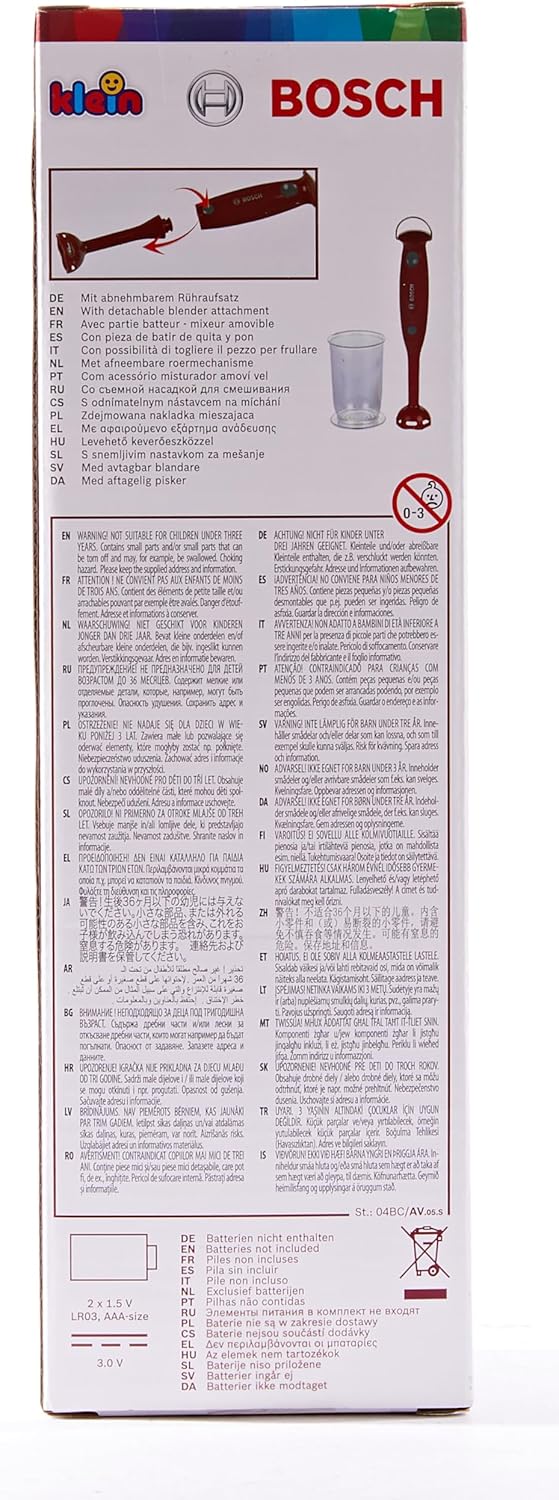 Toy with functions suitable for childrenBattery-operated hand blenderRequired batteries: 2x R03-AAA (Micro)Licenced Bosch hand blender by Theo Klein