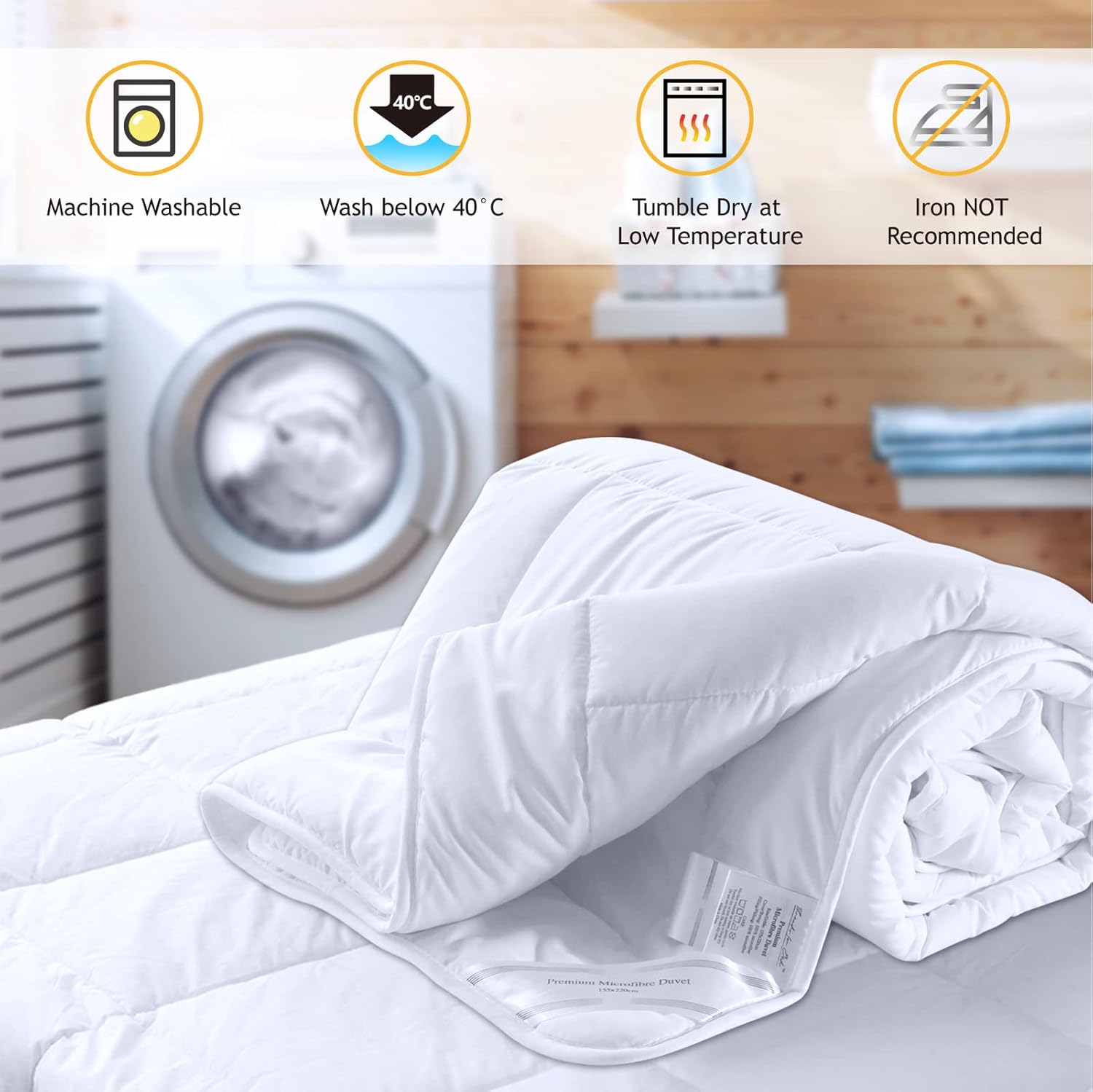 WASH CARE. After opening the package, fluff up your all-season microfiber duvet in a tumble dryer on a low heat for 30 minutes. When needed, machine wash in a cool delicate setting in a front loader and tumble dry in a large capacity dryer on low.