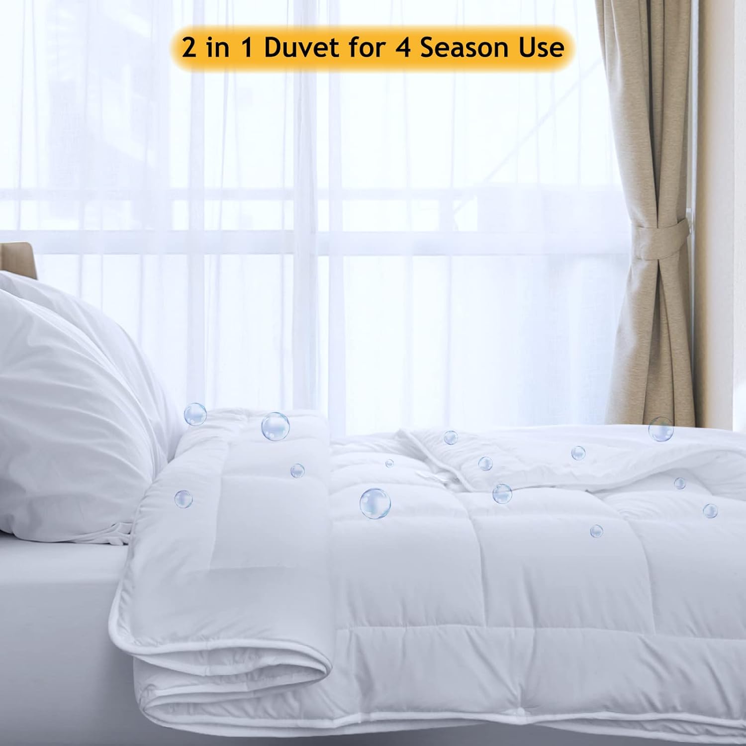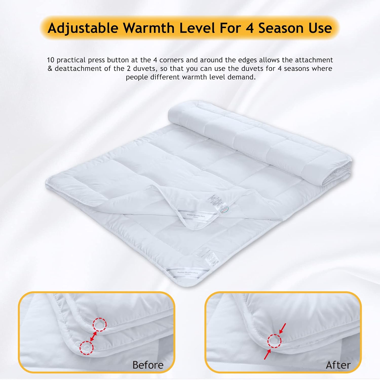ADJUSTABLE COMFORT ALL YEAR ROUND. Our detachable All-Season down-alternative duvet set includes one lighter tog microfiber duvet ideal for the summer months and one higher tog microfiber duvet that you can add to the lighter option for winter cosiness with durable press studs. Generously filled and plump for the ultimate in luxury and comfort.