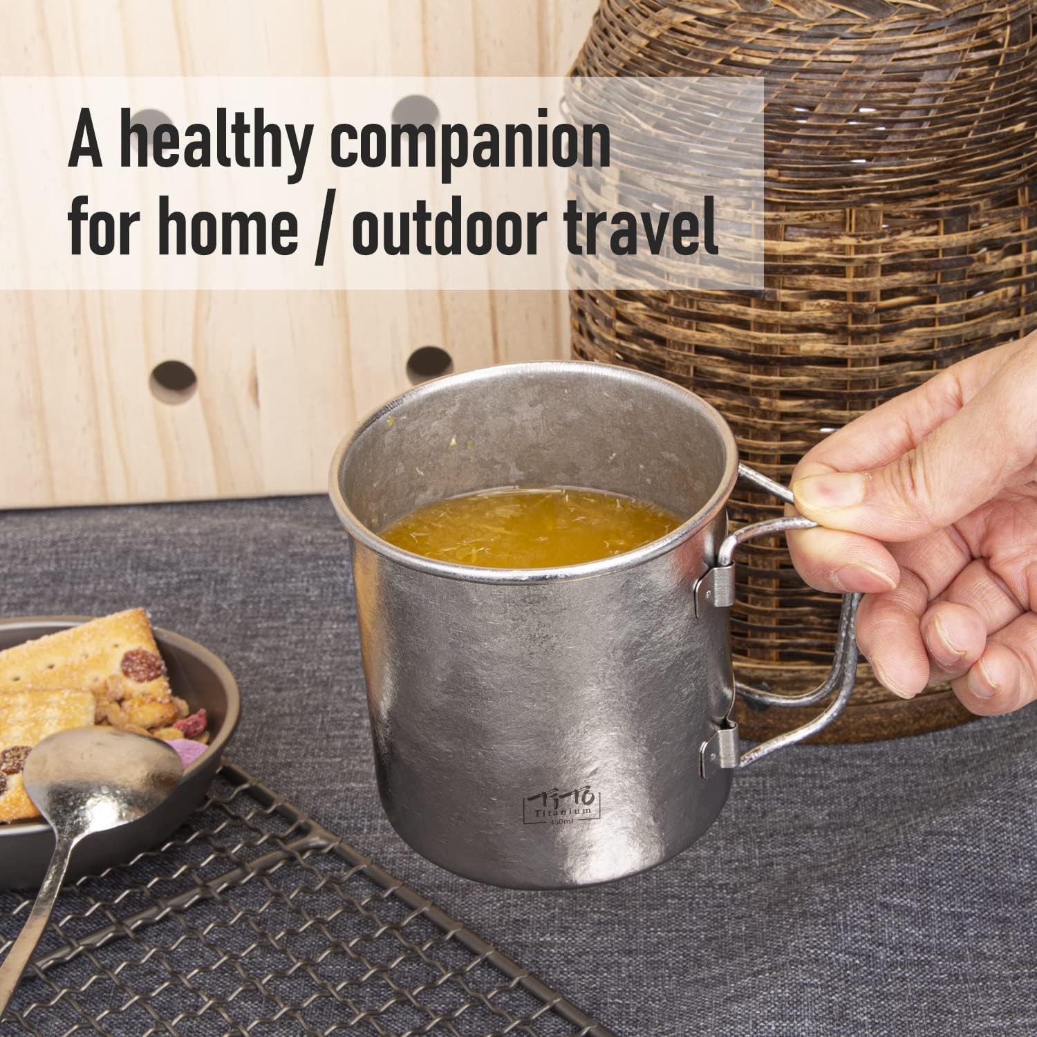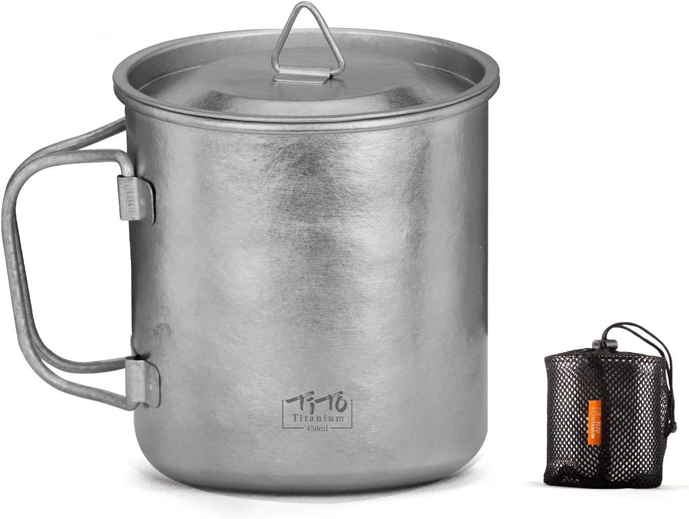 TiTo Titanium Cup Camping Tea Coffee Water Mug Ultralight Portable Cookware 450ml Foldable Handle Titanium Pot with Lid for Outdoor Backpacking Hiking Picnic Drinkware Open Fire (Bright Titanium)