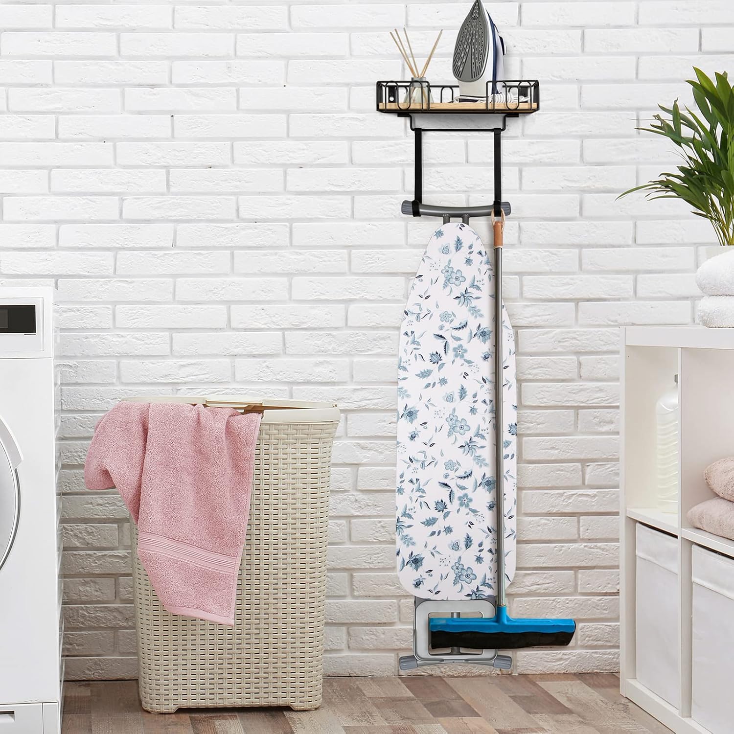 TJ.MOREE Ironing Board Hanger Metal Wall Mount Iron and Ironing Board Holder, Laundry Room Decor and Storage with Large Storage Black Wooden Base Basket and Removable Hooks