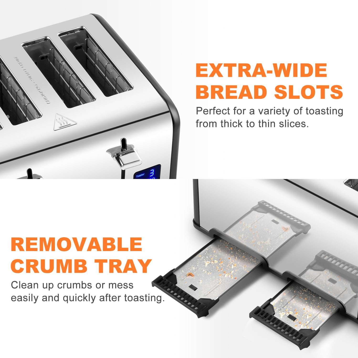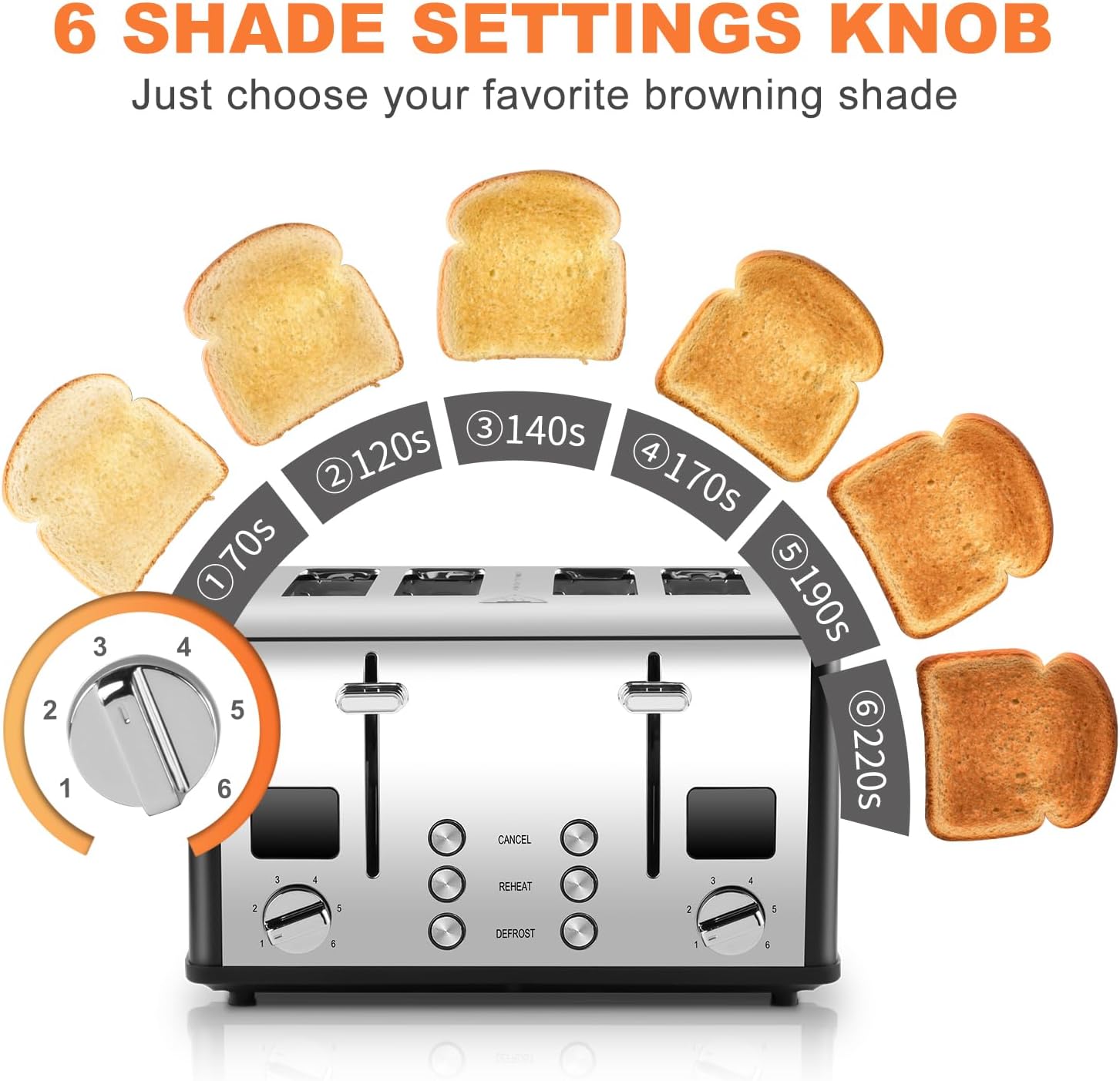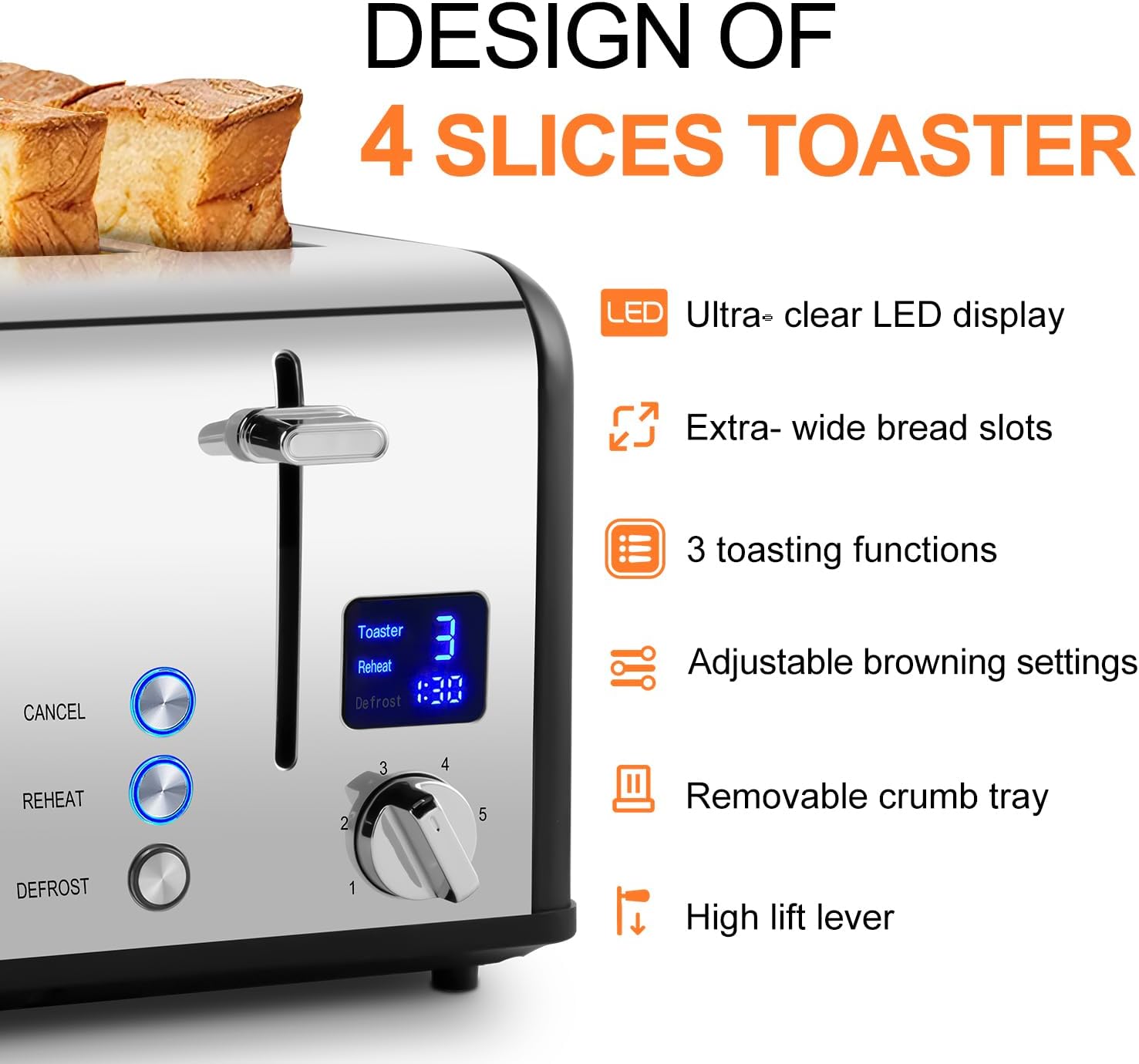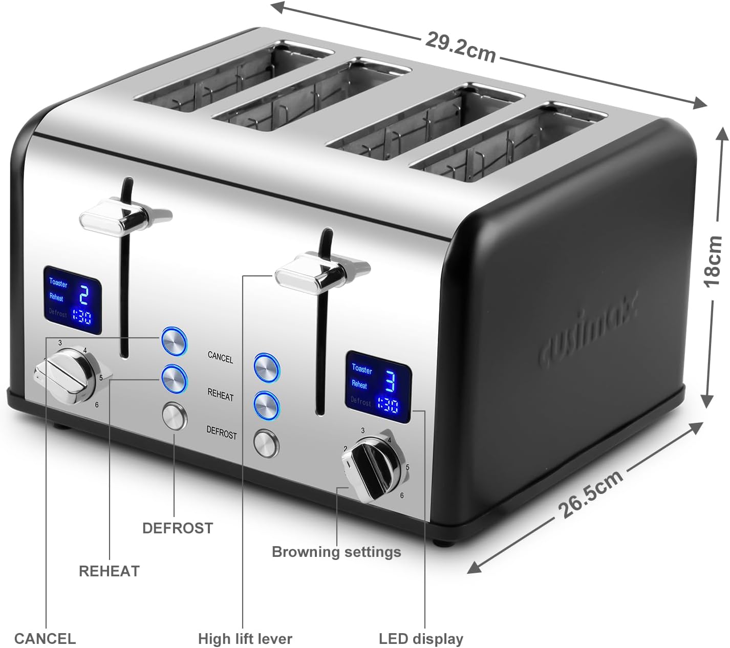Toaster 4 Slices, Cusimax Stainless Steel Toaster with Ultra-Clear LED Display & 4 Extra-Wide Slots, Defrost/Reheat/Cancel Function, 6 Browning Settings, Removable Crumb Tray, Black
