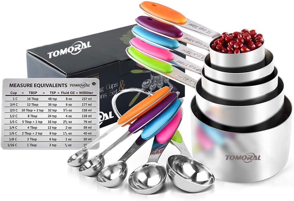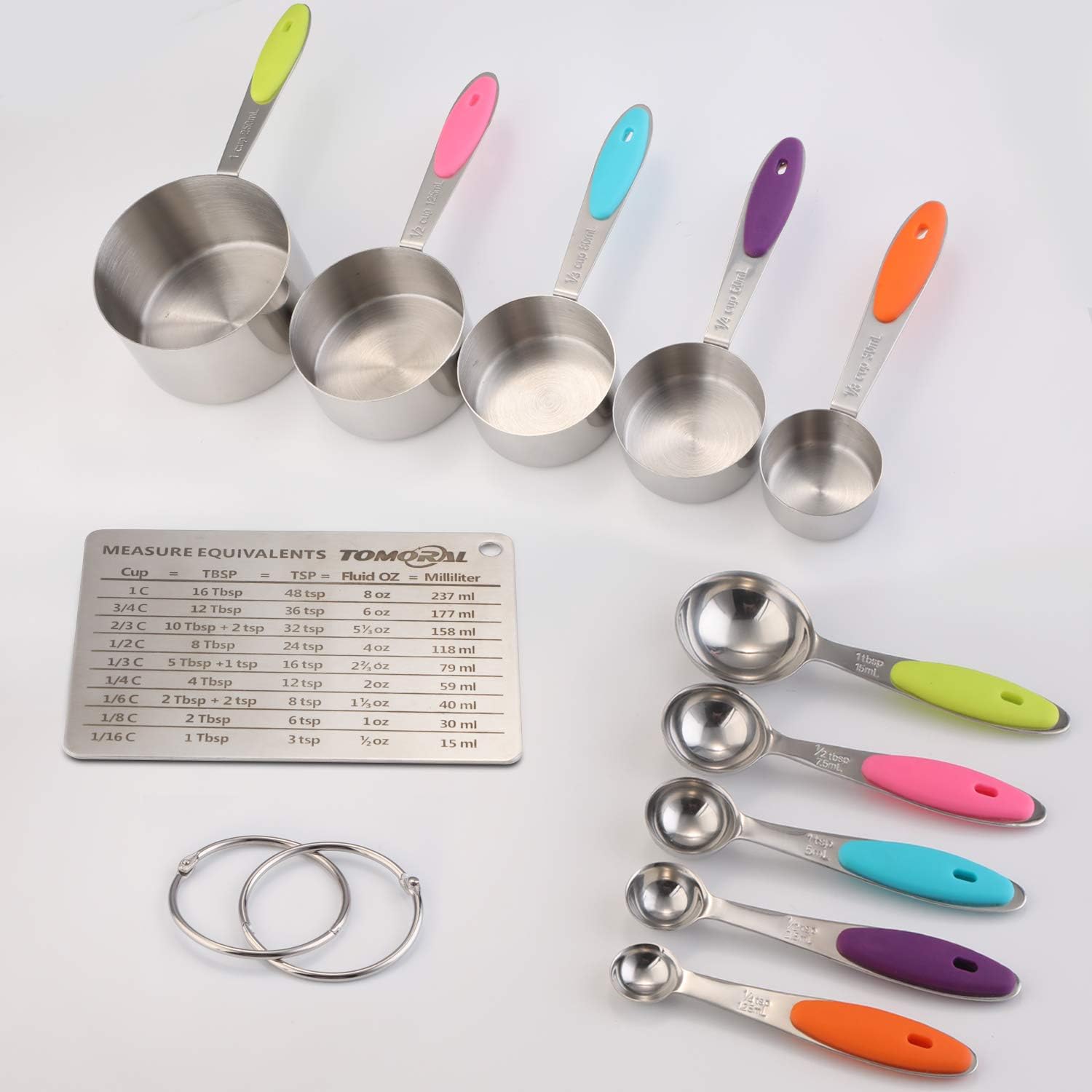 ♥ TOMORAL Stainless Steel Measuring Spoons and cups set, cooking will be quick and gives you an accurate measure for recipes without the hassle, 5 stainless measuring cups (⅛, ¼, ⅓, ½, 1 Cup) and spoons (1, ½, ¼ tsp, ½, 1 tbsp), 2 O rings and 1 Kitchen Professional Magnetic Measurement Conversion Chart