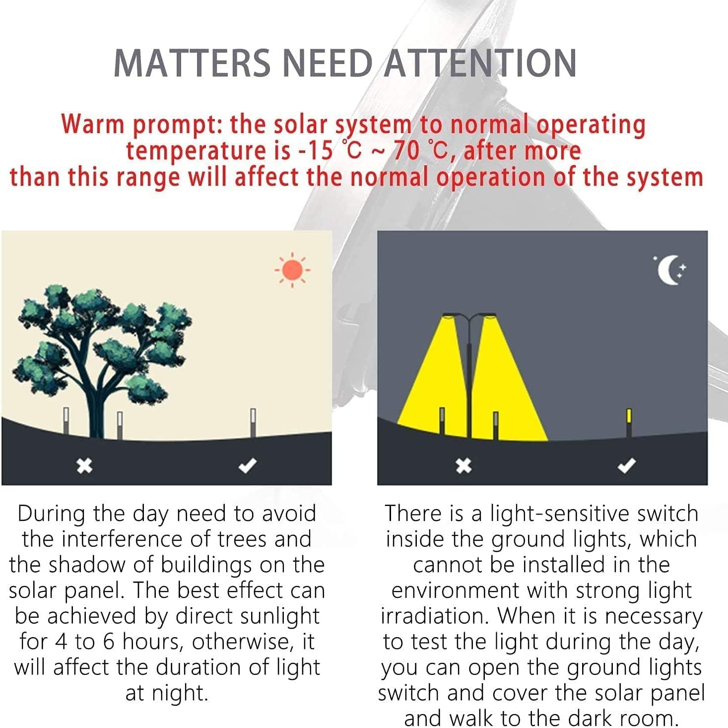 Unlike other lights, our solar ground lights consist of larger solar panel, which means better use of solar energy into electricity; it can be used for 8-10 hours only need charging in the sun for 6-8 hours; Besides, built-in sensitive light sensor, these solar path lights automatically turn on at night and turn off at dawn or in bright places. (Please make sure to “turn on” the switch before use)Before using the support, it is best to loosen the soil with a shovel and dig a suitable hole in the support (so as not to push it directly into the support and damage the support).Please keep the solar panels as clean as possible (dirty solar panels are not conducive to solar storage).For best results, install the light in a place where there is direct sunlight and no obstacles. (Avoid installing it on eaves, trees, window sills and other places with shadows and obstructions. During the day, the more sunlight the solar ground light receives, the longer the night time)If there is no strong sunlight or in winter, it may take longer to fully charge.