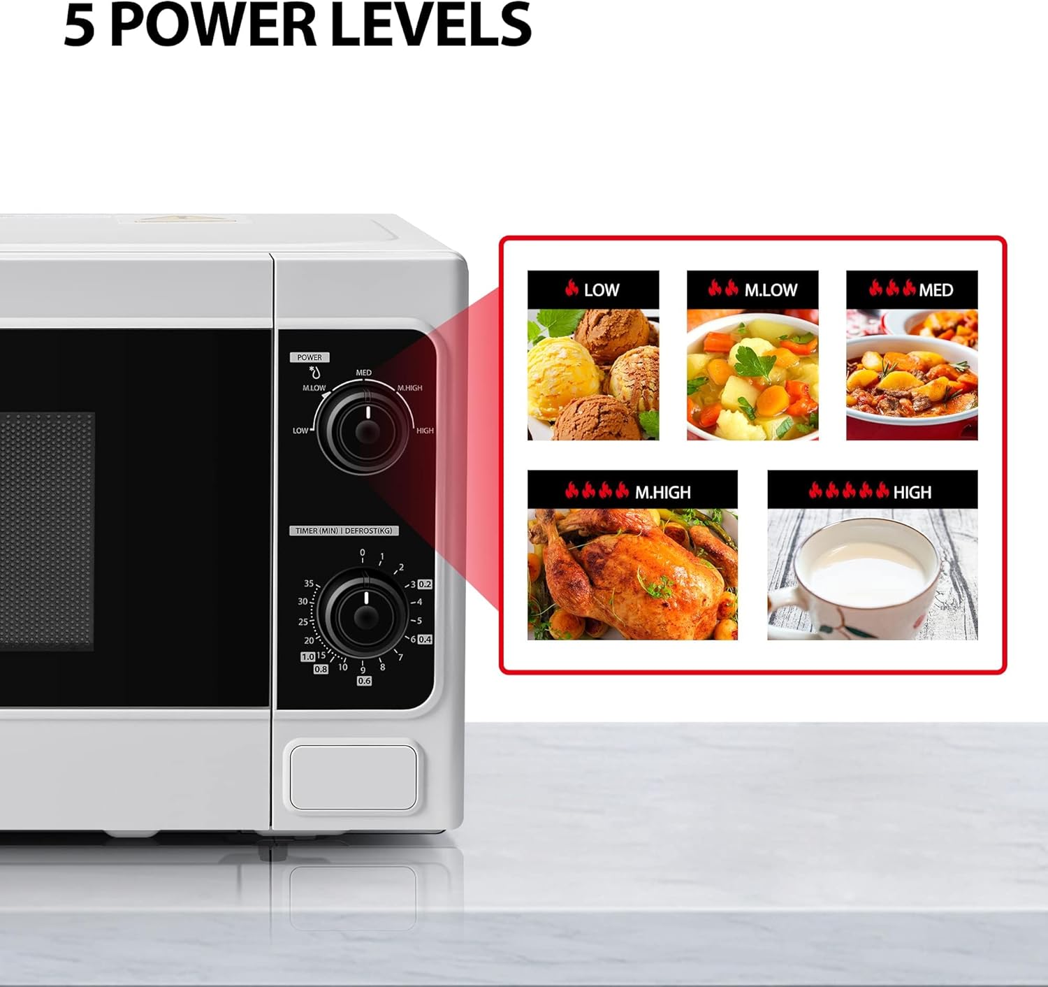 Adjustable Power Levels & Time: This 800w microwave offers 5 power settings and a manual timer going up to 35 minutes, allowing you to defrost, reheat, and cook according to your unique needs