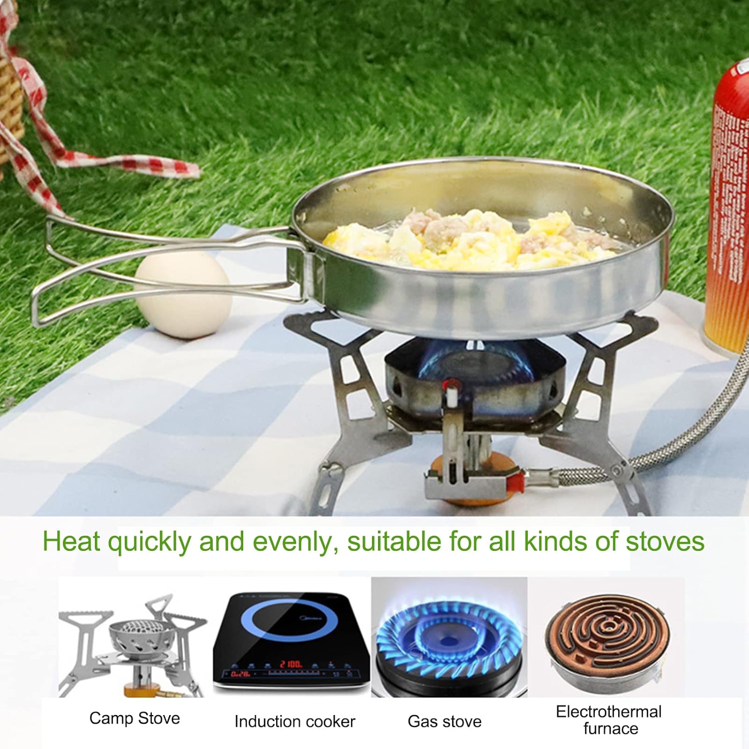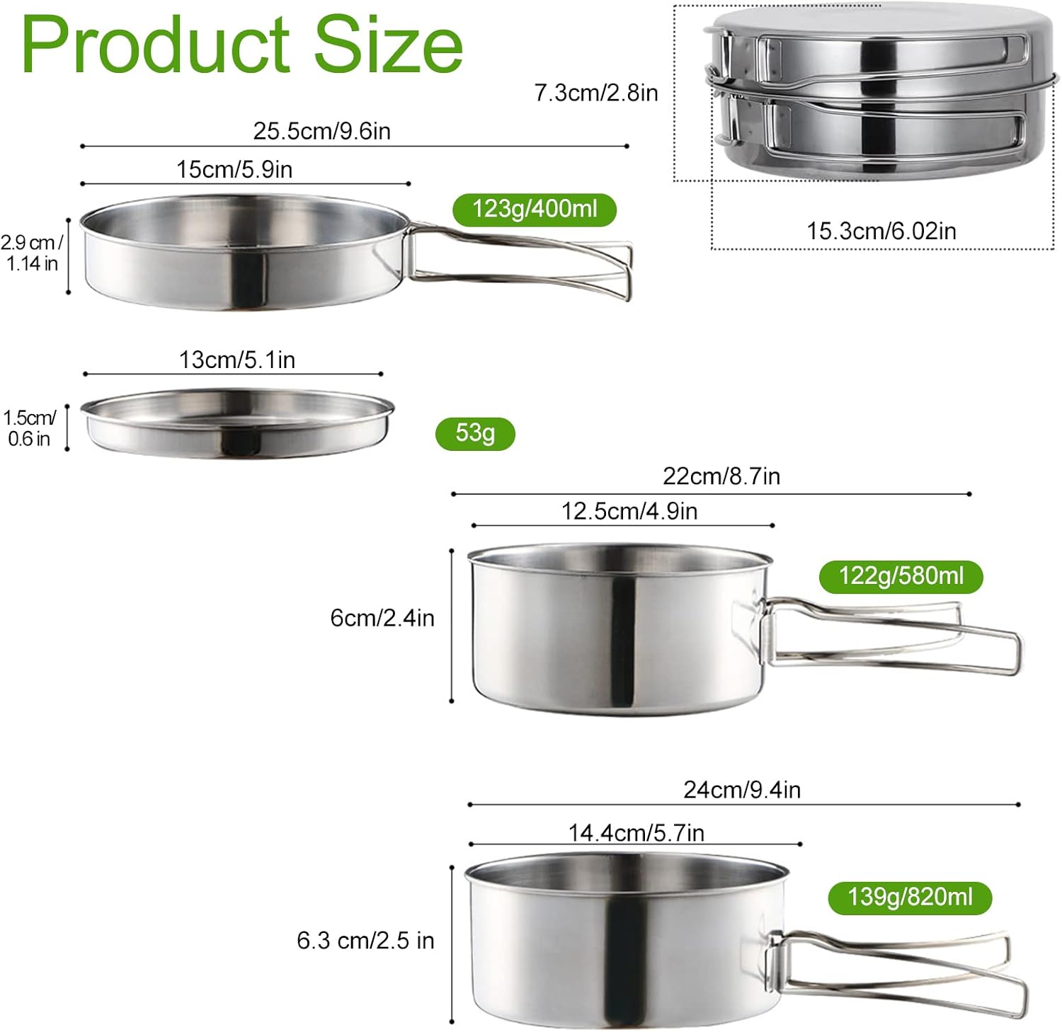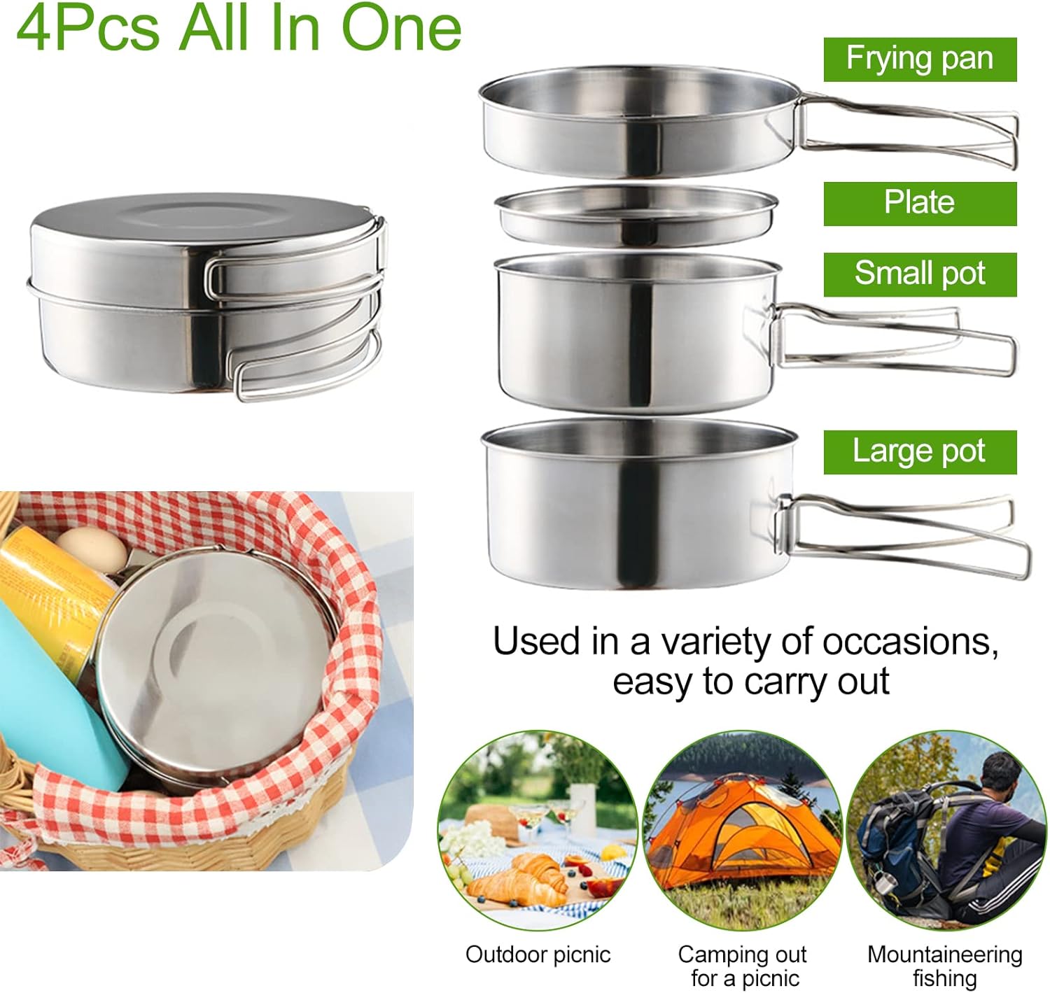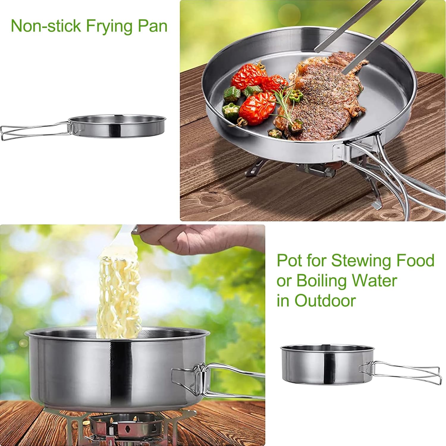 【High Quality】This cookware set is made of high quality stainless steel, the highly polished surface is easy to clean, high temperature and corrosion resistant, and can be heated directly on an open flame. Round edges prevent cutting. Durable enough to fit in any outdoor environment.