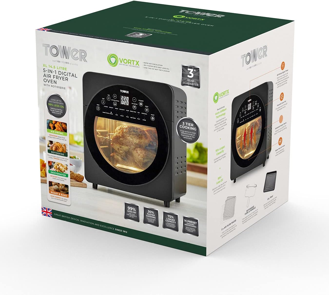 Tower T17051BLK, Vortx XL 14.5L 5-in-1 Digital Air Fryer Oven with Rotisserie, 1700W Power, Black
