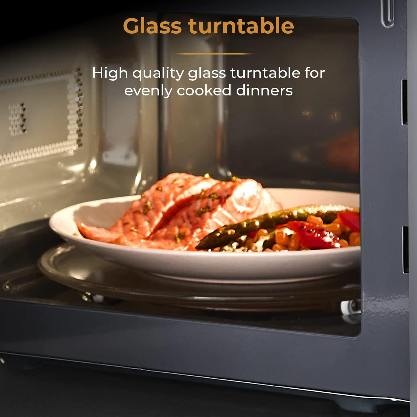 Conveniently adjust the 5 power settings with a maximum output of 800W to suit the specific cooking job. The handy 8 pre-set programmes ensure you get the best results when heating your meals, simply select the chosen pre-set specific to your meal including a defrost function – cook emergency snacks and meals straight from frozen. It’s easy to fit a standard sized dinner plate inside with the spacious 20 litre capacity. The glass turntable rotates the food to ensure there are no cold spots.