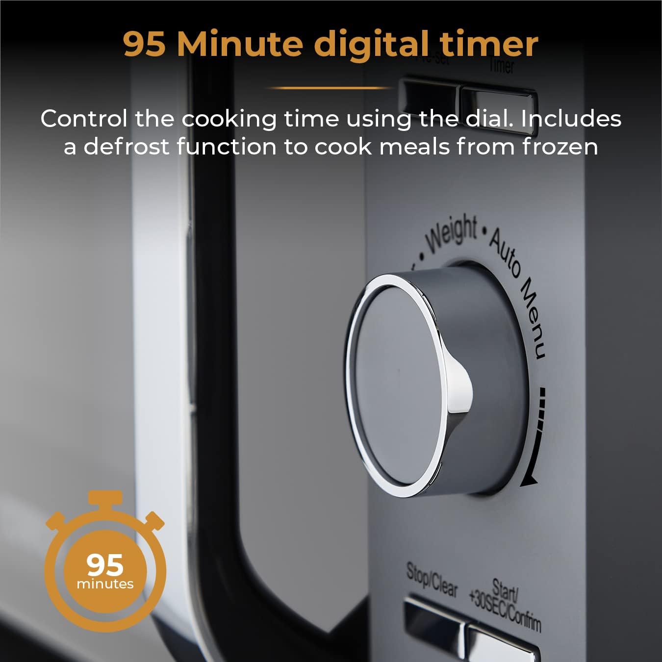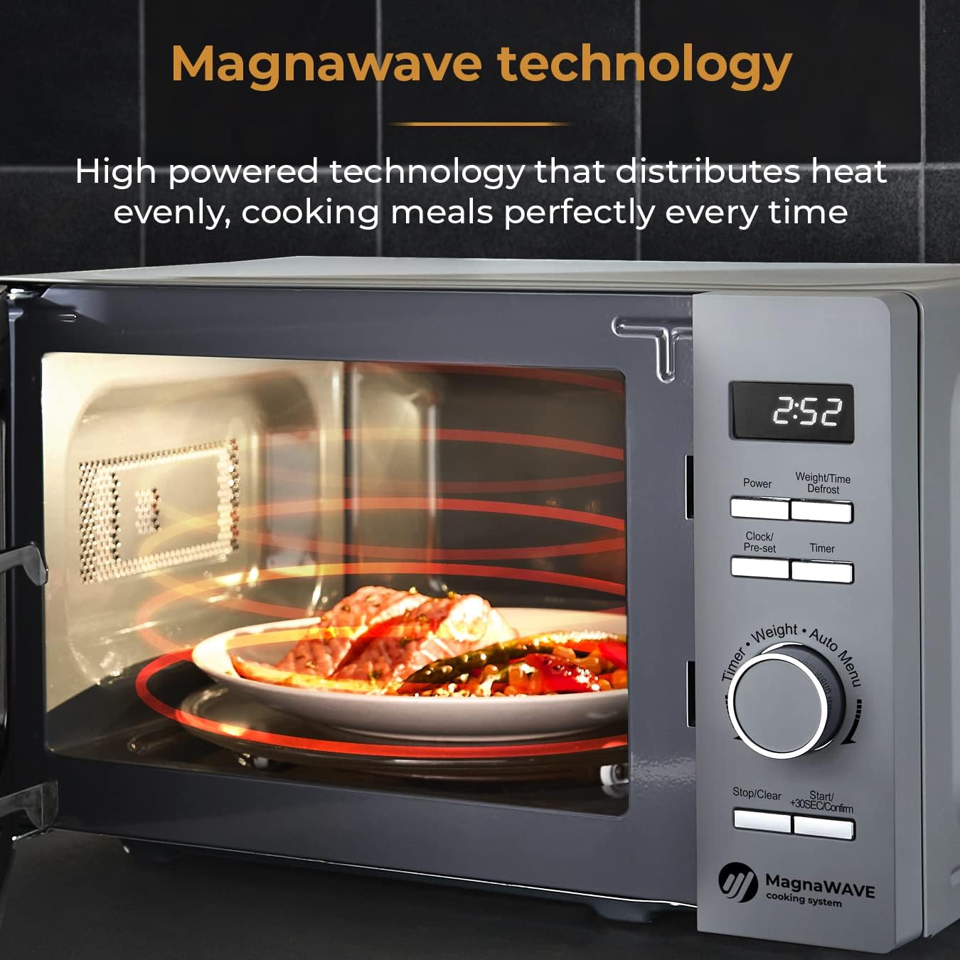 The 5 power settings can be amended to suit every meal with a maximum output of 800W 20 Litre capacity is large enough to fit a standard sized dinner plate Adjust the 95-minute timer to cater specifically to your meal or snack Defrost function for convenience, allows you to cook straight from frozen Intelligent Magnawave technology is high powered, distributing heat evenly for consistent results Set the microwave using the pre-set automatic programmes to cook meals easily High quality 255mm glass turntable is designed to offer even heat distribution