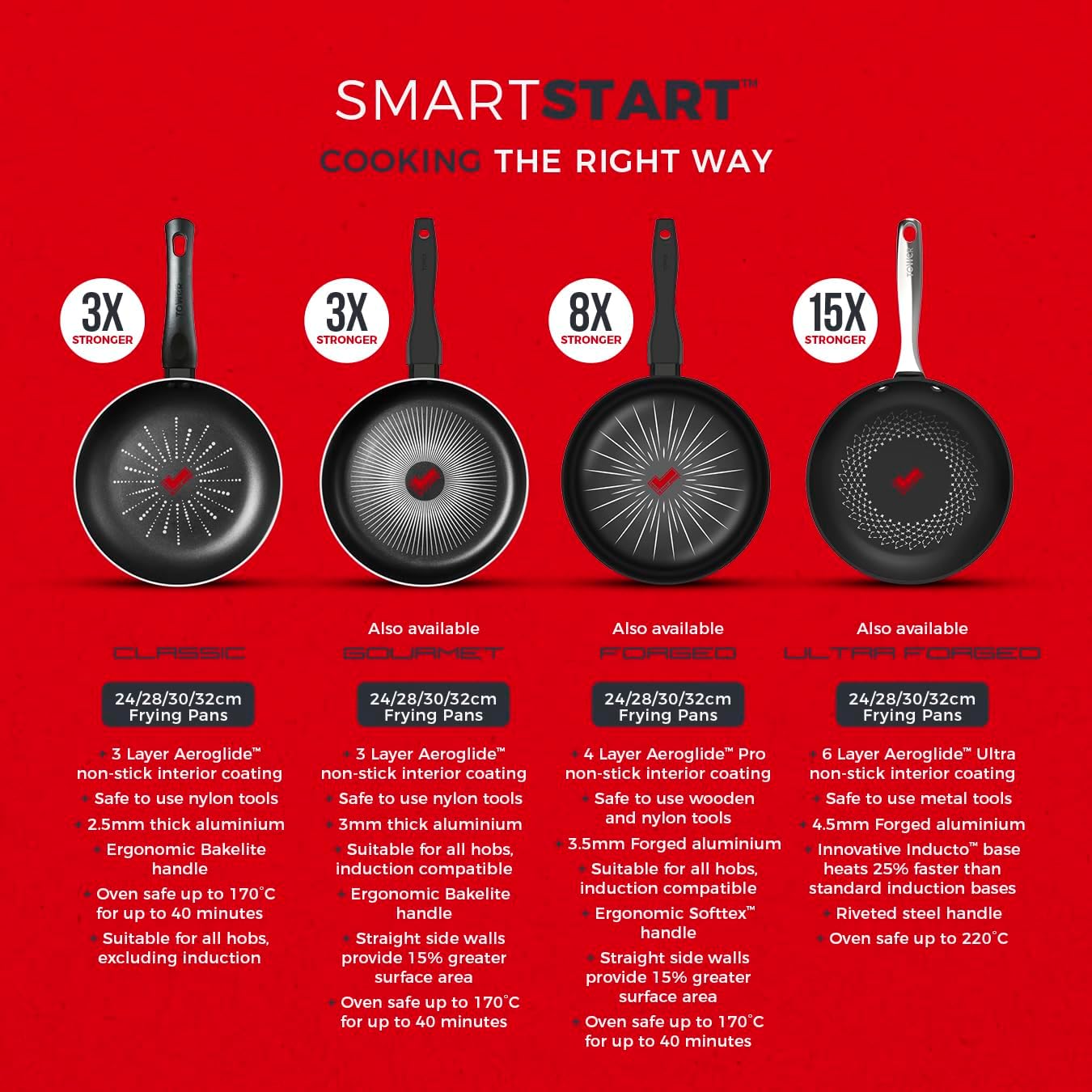 SMARTSTART TECHNOLOGY: A temperature sensor is built into the non-stick coating that changes to dark red once the pan reaches the optimum temperature. Pop the pan on the hob to heat up, wait for the SmartStart tick to change to dark red & take the guess work out of cooking for perfect results