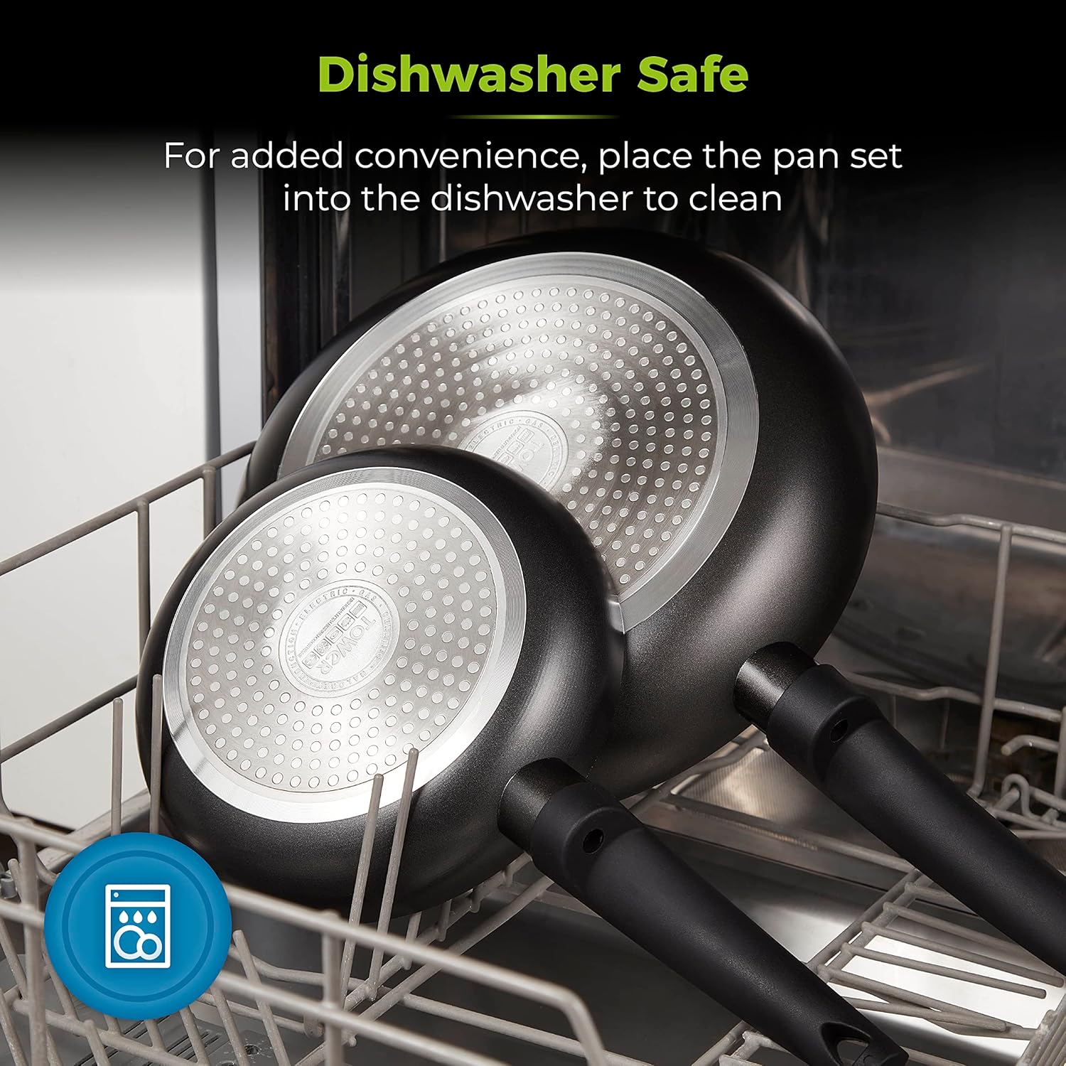 DISHWASHER SAFE: For added convenience, place the pan set into the dishwasher to clean. Hand wash recommended to maintain the finish