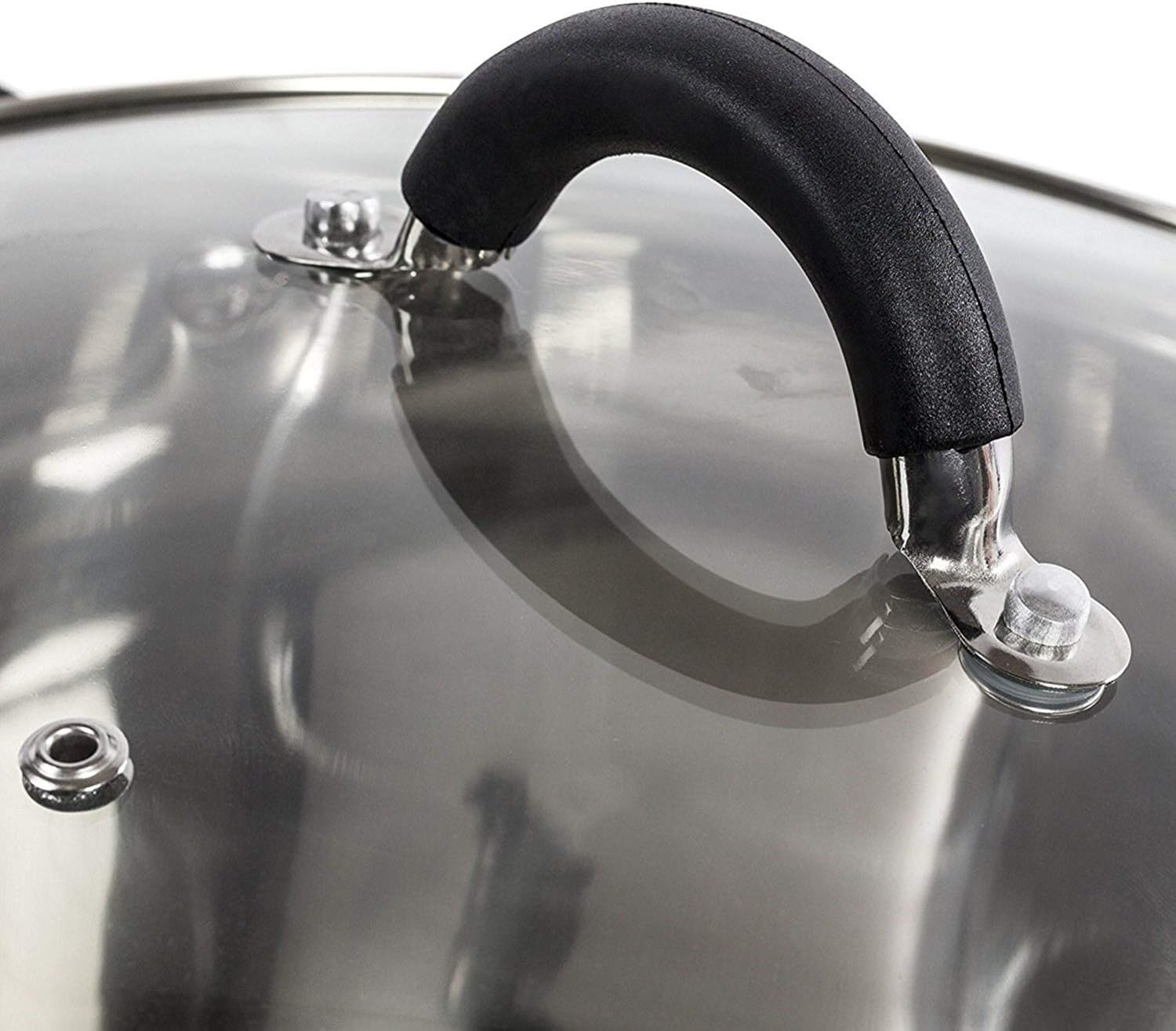 Glass lids with steam vent for efficient cooking and robust riveted handles with silicone cover