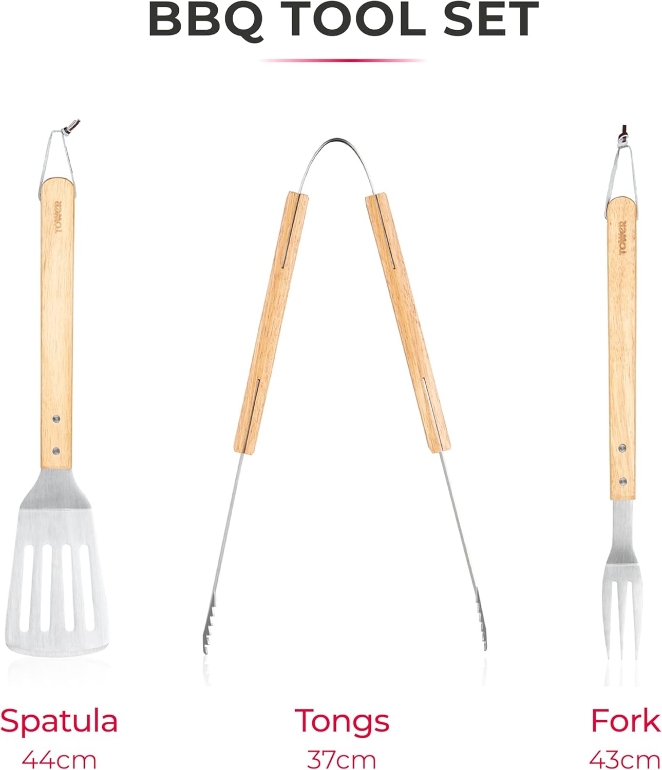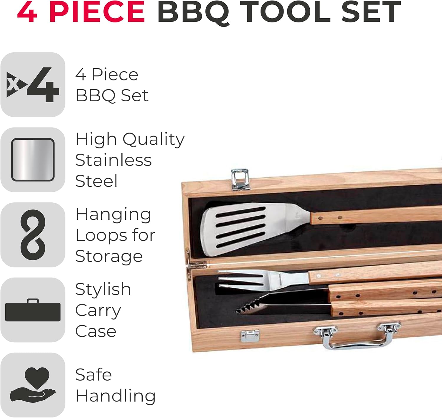 Tower T932005 BBQ 4 Piece Tool Set with Wooden Handles and Carry Case, Stainless Steel