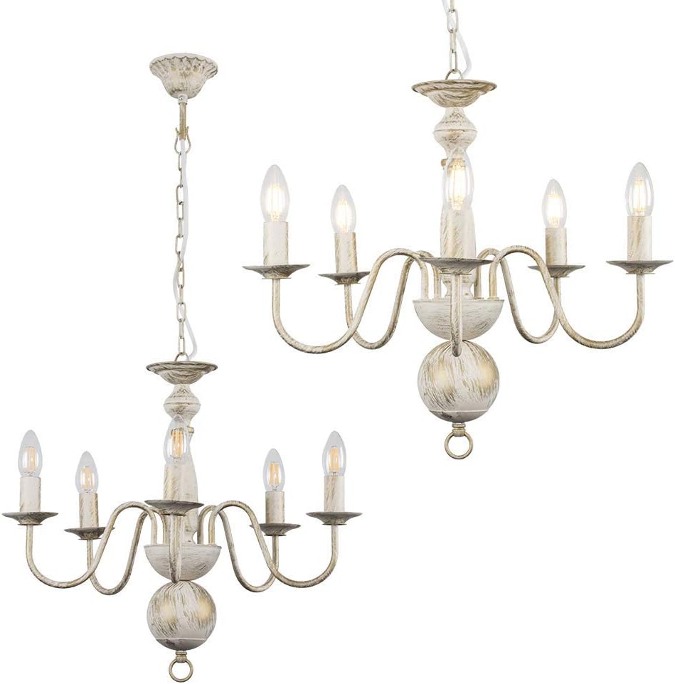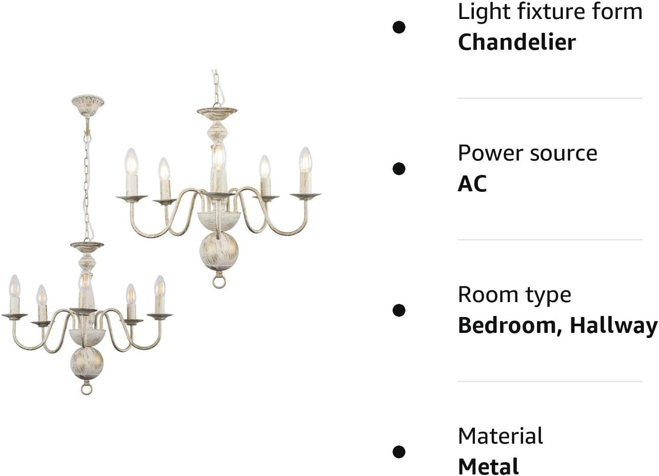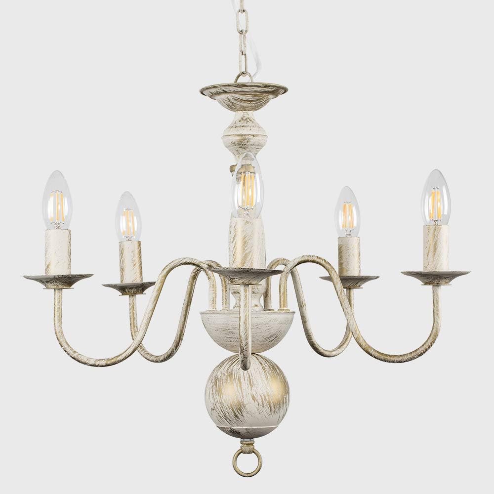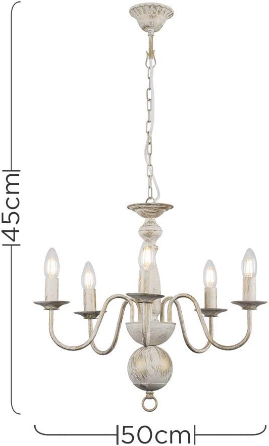 Traditional Flemish Style 5 Way Ceiling Light Chandelier in a Shabby Chic Distressed White Effect FinishIdeal for Lounges, Bedrooms, Hallways and Other Living AreasMeasurements: Height 450mm x Diameter 500mm5 x 40w SES E14 Candle Bulbs are Required – Not SuppliedReference Number: 24067