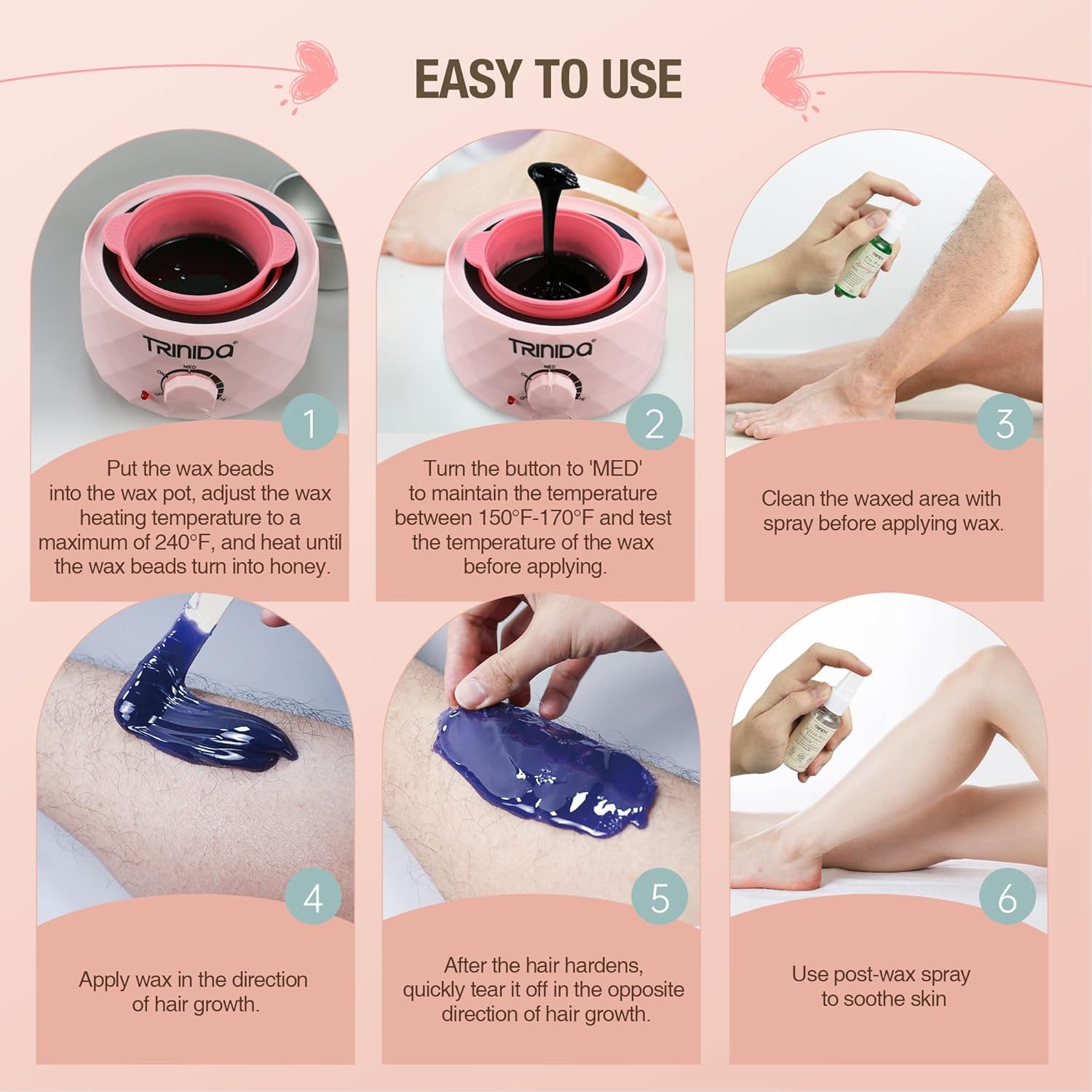 [ IDEAL FOR HAIR REMOVAL ] – TRINIDa Professional Waxing Kit is suitable for full body hair removal for women and men. You can enjoy salon-quality results at home without going to an expensive salon. The included silicone wax pot is easy to clean. After the melted wax is completely solidified, it can be peeled off directly for next use. It won’t waste and will save you a lot of cleaning time.