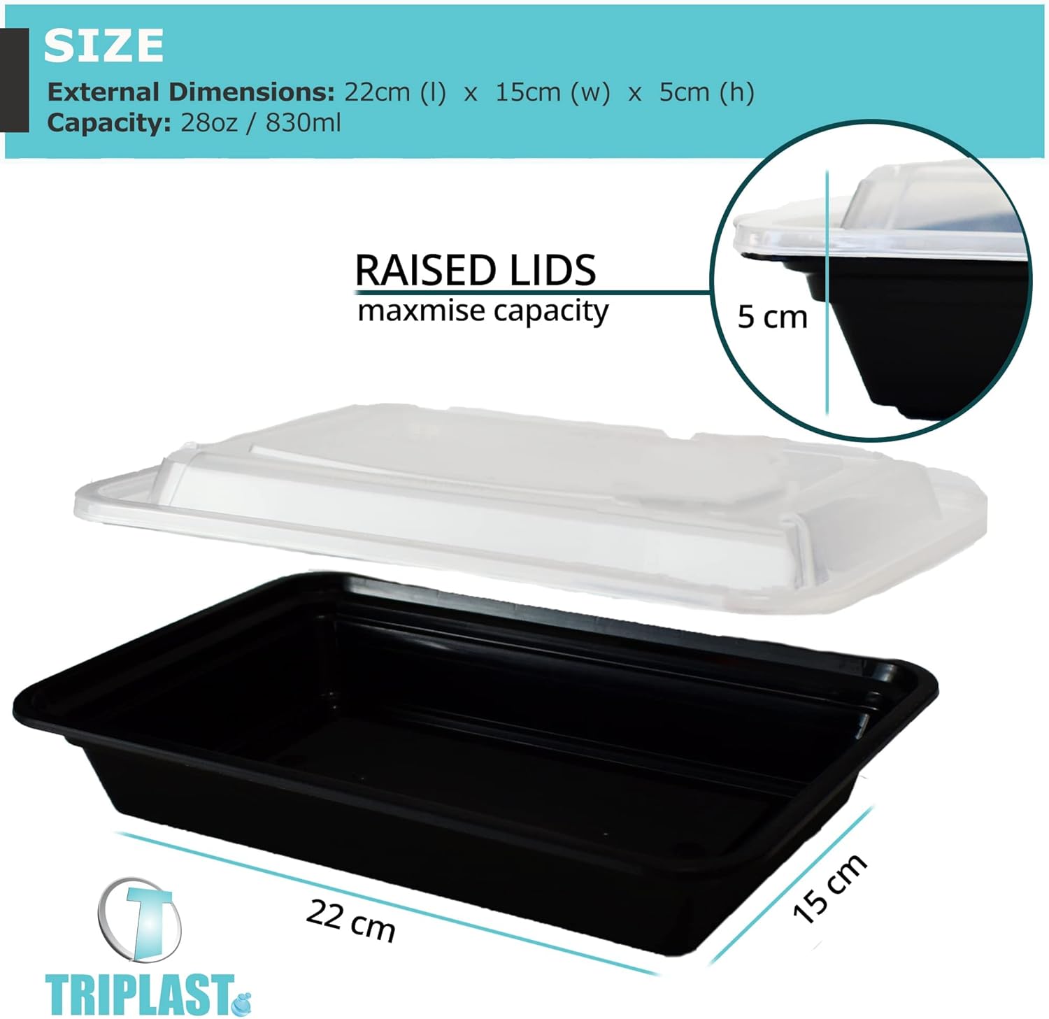 CONTENTS: A Pack of 10 Plastic Food Containers with See Through Lids | TYPE: 1 Compartment | SHAPE: Rectangular | CAPACITY: 28oz / 830ml | SIZE: 22cm (l) x 15cm (w) x 5.5cm (h) | MADE FROM: BPA Free Polypropylene (PP)