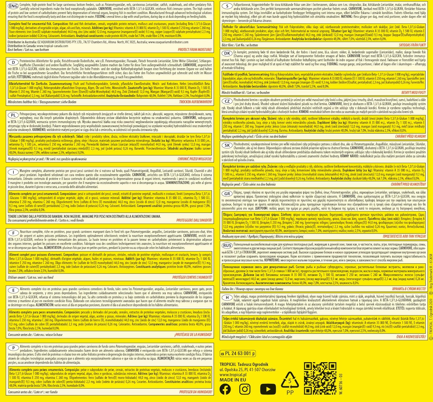 Protein-rich complete food for large, meat-eating bottom fish, such as potamotrygonidae, river room, meat-eating loricariidae, real catfish (siluridae), snake head fish (channidae) and other predatory fish. Carefully selected ingredients make the food exceptionally tasty for these animals. Carnivore, enriched with Beta-1.3/1.6-Glucan, strengthens the immune system of the fish. The high protein and low carbohydrate content prevent greasing of the internal organs and thus keep the fish in excellent health. The advanced manufacturing process ensures that the food tastes exceptionally good to fish and does not disintegrate in the water. Feeding: several times a day, small portions during the day or at dusk, depending on eating habit. Complete food for ornamental fish. Composition: fish and fish by-products, cereals, vegetable protein extracts, molluscs and crustaceans, yeasts (including beta 1.3/1.6 glucan 1,000 mg/kg), by-products of vegetable origin, algae, oils and fats, minerals. Additives: vitamins, provitamins and chemically defined substances with similar effects: vitamin A 35,000 IU/kg, Vitamin D3 1,500 IU/kg, Vitamin E 250 mg/kg, vitamin C 260 mg/kg. Compounds of trace elements: E1 iron 44.0 mg/kg, E6 zinc 12.0 mg/kg, E5 manganese 9.3 mg/kg, E4 copper 2.3 mg/kg, E2 iodine 0.26 mg/kg, E8 selenium 0.26 mg/kg, E7 molybdenum 0.06 mg/kg, E3 mg/kg, E3 Cobalt 0. 01mg/kg Dyes. Antioxidants. Analytical ingredients: crude protein 48.0%, crude oils and fats 9.0%, crude fibre 2.0%, moisture 8.0%.