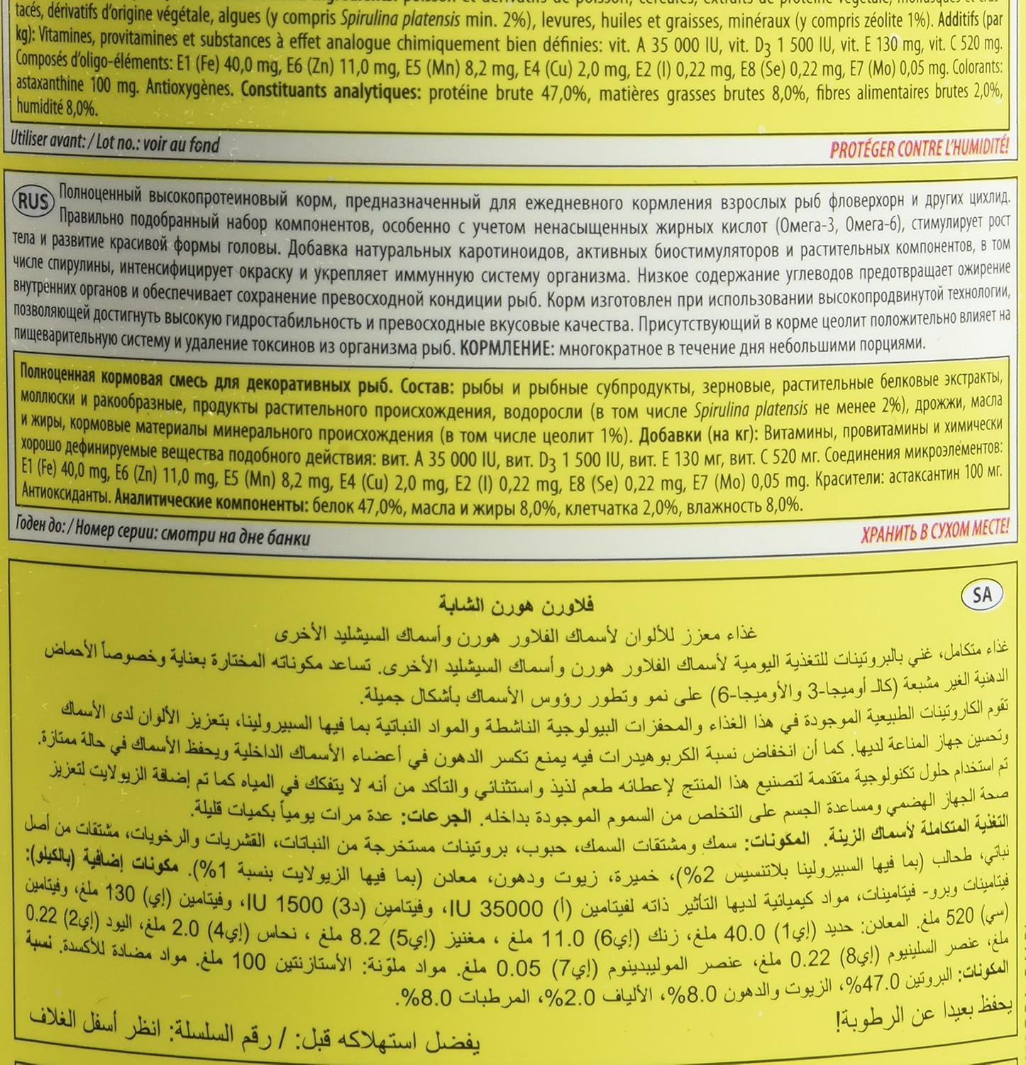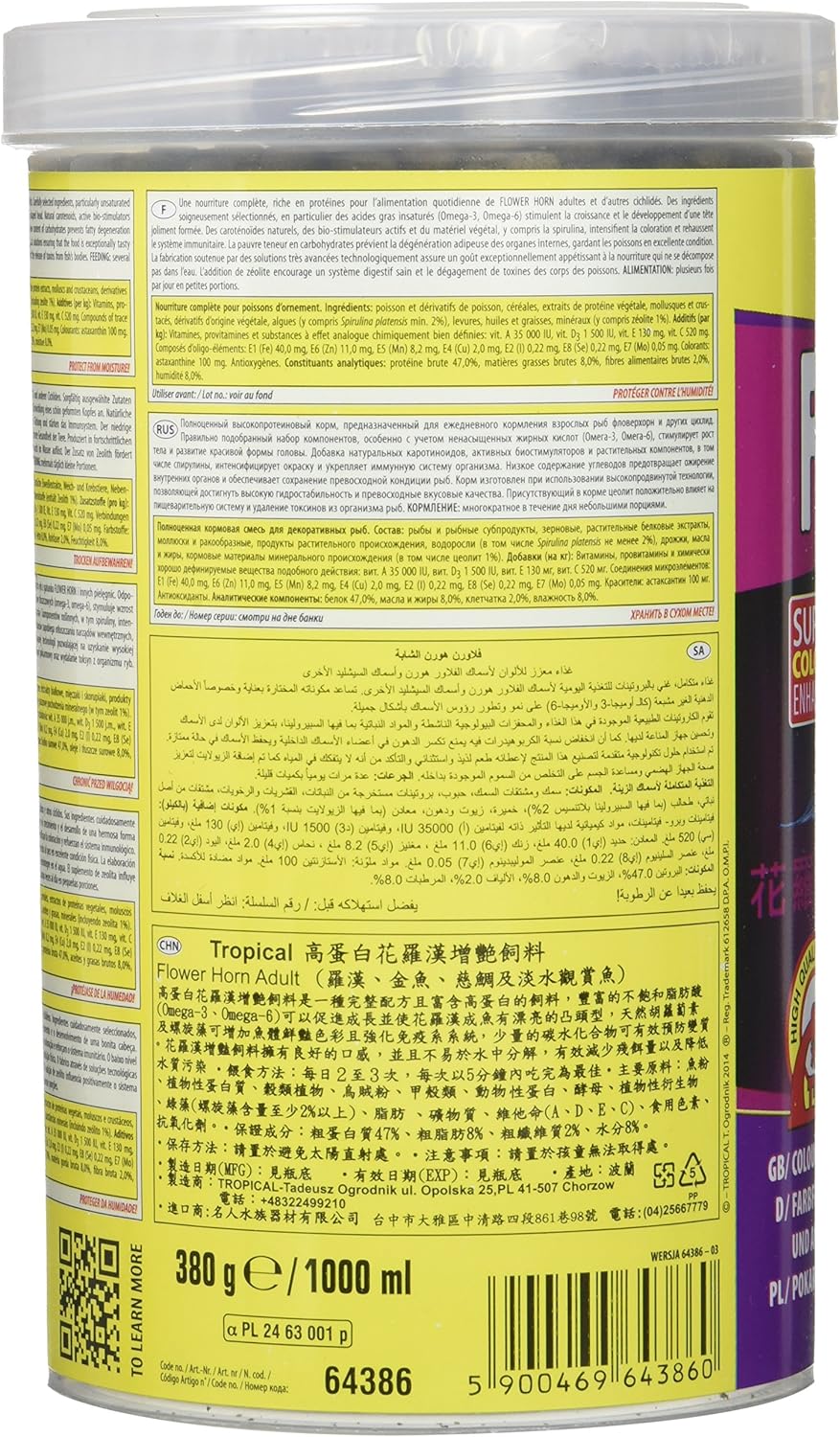 (as of [price_update_date] – DetailsFlower Flower Horn Adult Pellet Color Strengthening Lining for Horns and other Cichlids. Protein-rich, floating pellets for daily feeding of horn cichlids and other cichlidae fish. A high level of slightly assimilable protein facilitates the growth of fish and encourages it to spawn. Unsaturated fatty acids, omega-3 and omega-6, the development of a forehead hump, a characteristic feature of the flower horns and large cichlids from South and Central America. Plant material and spirulina are the source of natural carotenoids. The food has also been enriched with natural astaxanthin (100 mg/kg) ensuring the magnificent coloration in regular feeding with Flower Horn Adult. The lowered content starch protects carnivorous fish against fat degeneration of internal organs. The pellets do not decay in the water, thus maintaining their structure for a long time. In this way, they do not contaminate or release valuable nutrients. The volume of pellets is insignificantly increased under the influence of water, therefore, no risk of indigestion in eating fish will help.