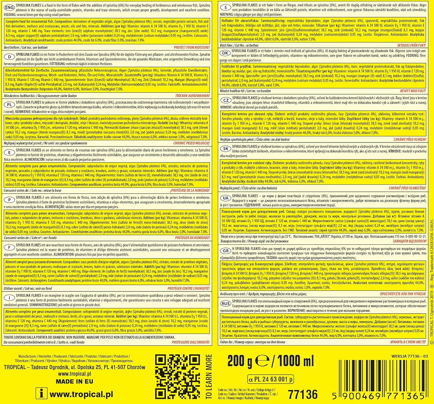 Spirulina Flakes is a plant-based complete fish food in the form of flakes with spirulina platensis algae (6%) for daily feeding of plant-eating and omnivorous fish. Spirulina platensis is the source of easy-to-assimilate protein, vitamins and trace elements, that ensure healthy growth, a species-appropriate development and excellent condition. It is also rich in natural carotenoids, which intensify the colours and impact many physiological processes, including growth and reproduction. Fibres regulate metabolism and prevent constipation. Feeding: plant-eating fish – Several Times During The Day In Small portions according to the number of fish – for night eater shortly before switching off the light. As additional food for omnivorous fish, switch with other tropical food types. Complete food for ornamental fish. Composition: Derivatives of vegetable origin, algae (Spirulina platensis min. 6%), vegetable protein extracts, fish and fish derivatives, cereals, molluscs and crustaceans, yeasts, oils and fats, minerals. Additives: Vitamins, provitamins and chemically defined substances with similar effects: Vitamins A: 34,500 IU/kg; vitamin D3: 1,950 IU/kg; vitamin E: 120 mg/kg; vitamin C: 440 mg/kg; Compounds of trace elements: E1 iron: 38.5 mg/kg; E6 zinc: 10.2 mg/kg; E5 manganese: 8.3 mg/kg; E4 copper: 2.0 mg/kg; E2 iodine: 0.24 mg/kg; E8 selenium: 0.25 mg/kg; E7 molybdenum: 0.05 mg/kg; E3 cobalt: 0.01 mg/kg; Lecithin. Colouring agents. Antioxidants. Analytical components: Crude Protein 44.0 %, Raw Oils and Fats 6.0 %, Raw Fibre 3.0 %, Moisture 7.0 %. [English language not guaranteed.]
