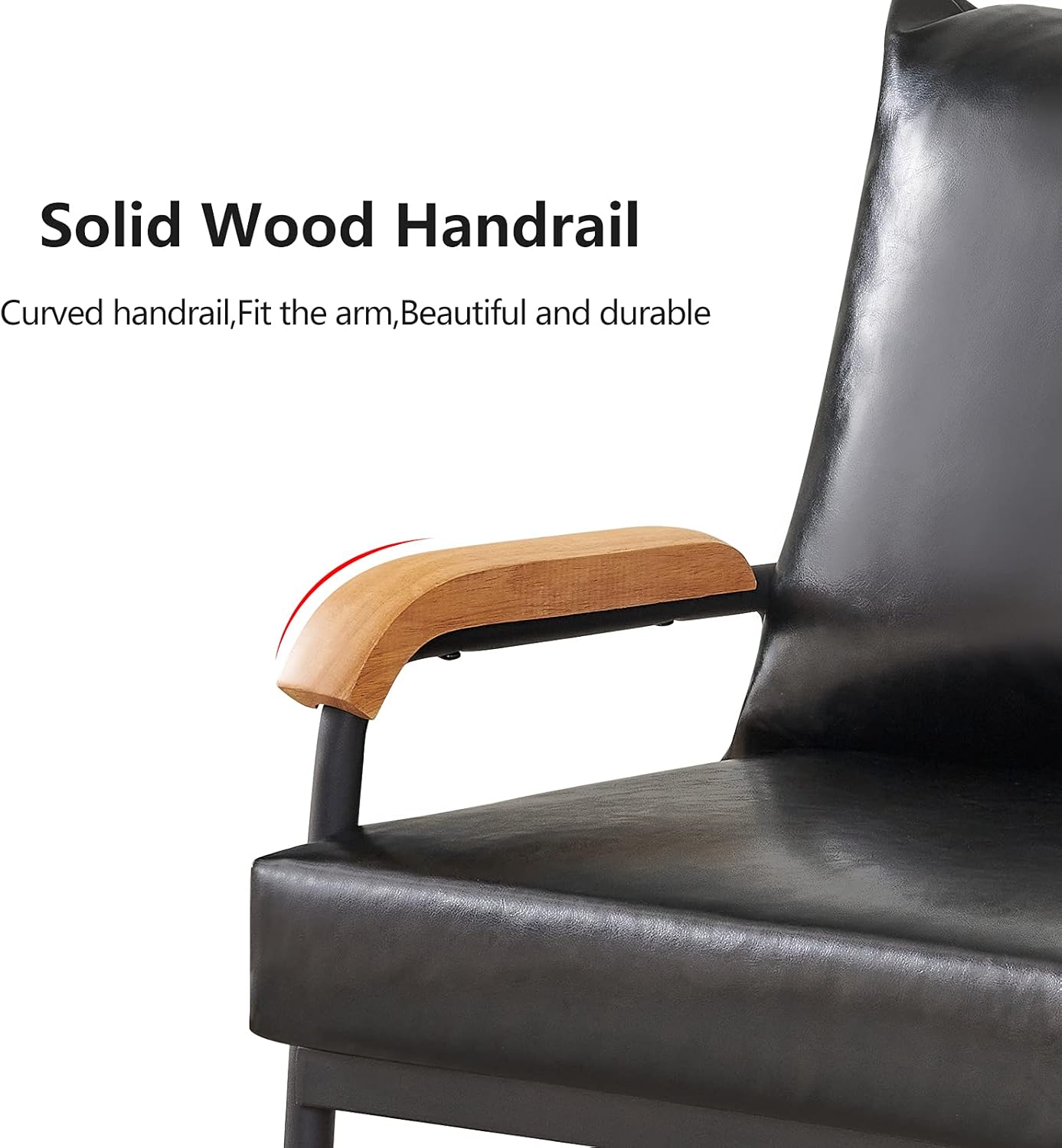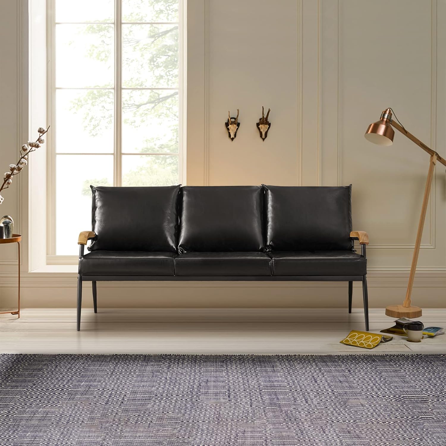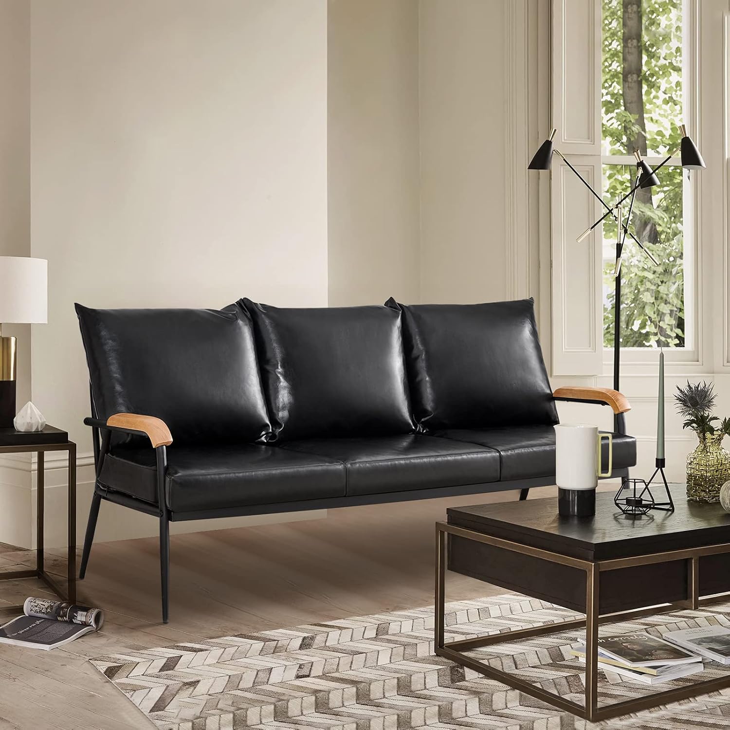 TUKAILAi 3 Seater Sofa for Living Room Retro Faux Leather Lounge Sofa Settee with Wooden Arms and Metal Legs Comfoy Padded Seat Couch for Home Office Reception Bedroom Black