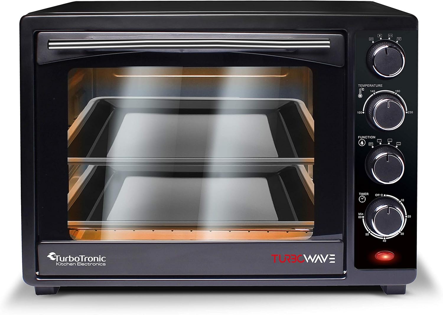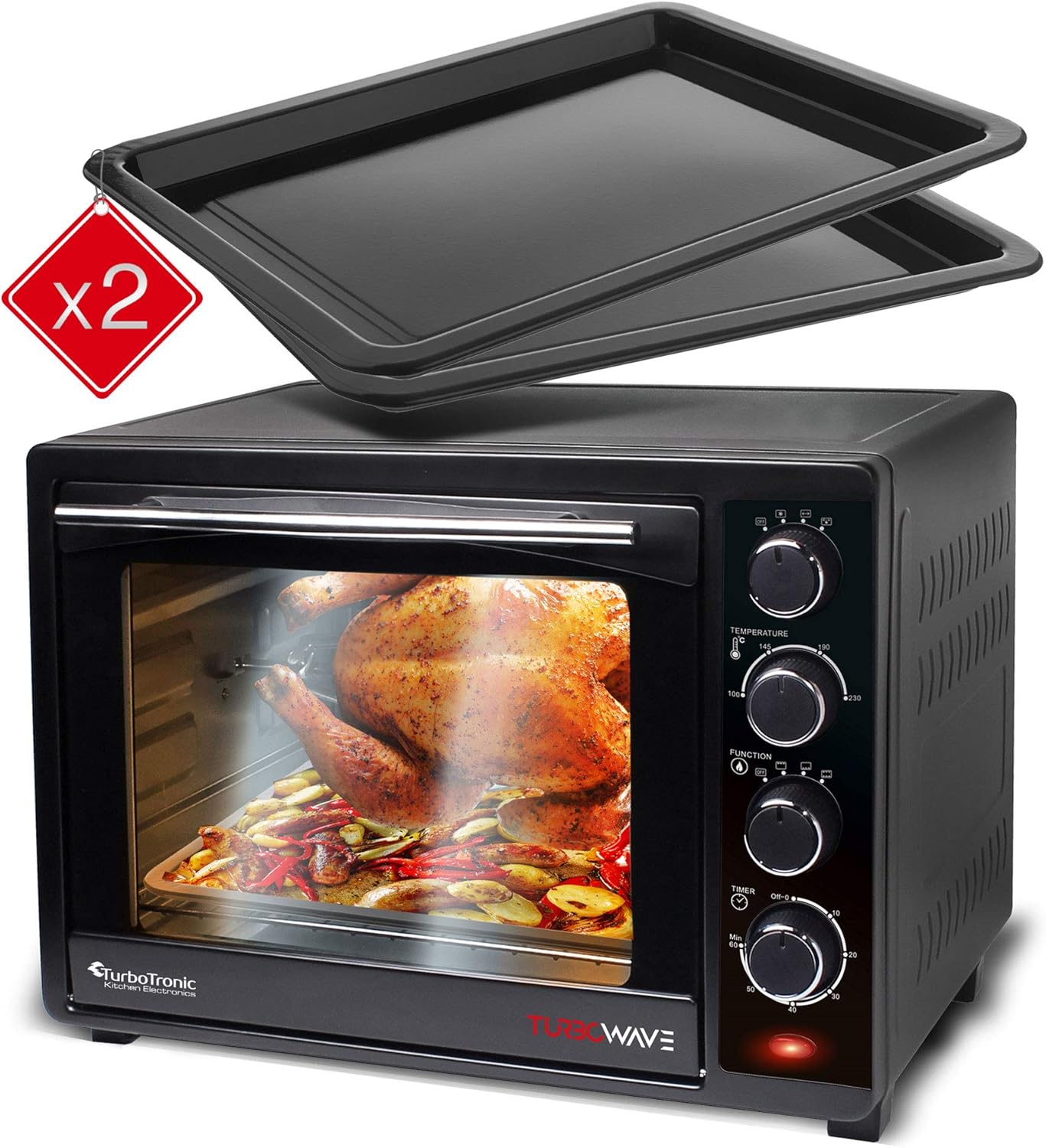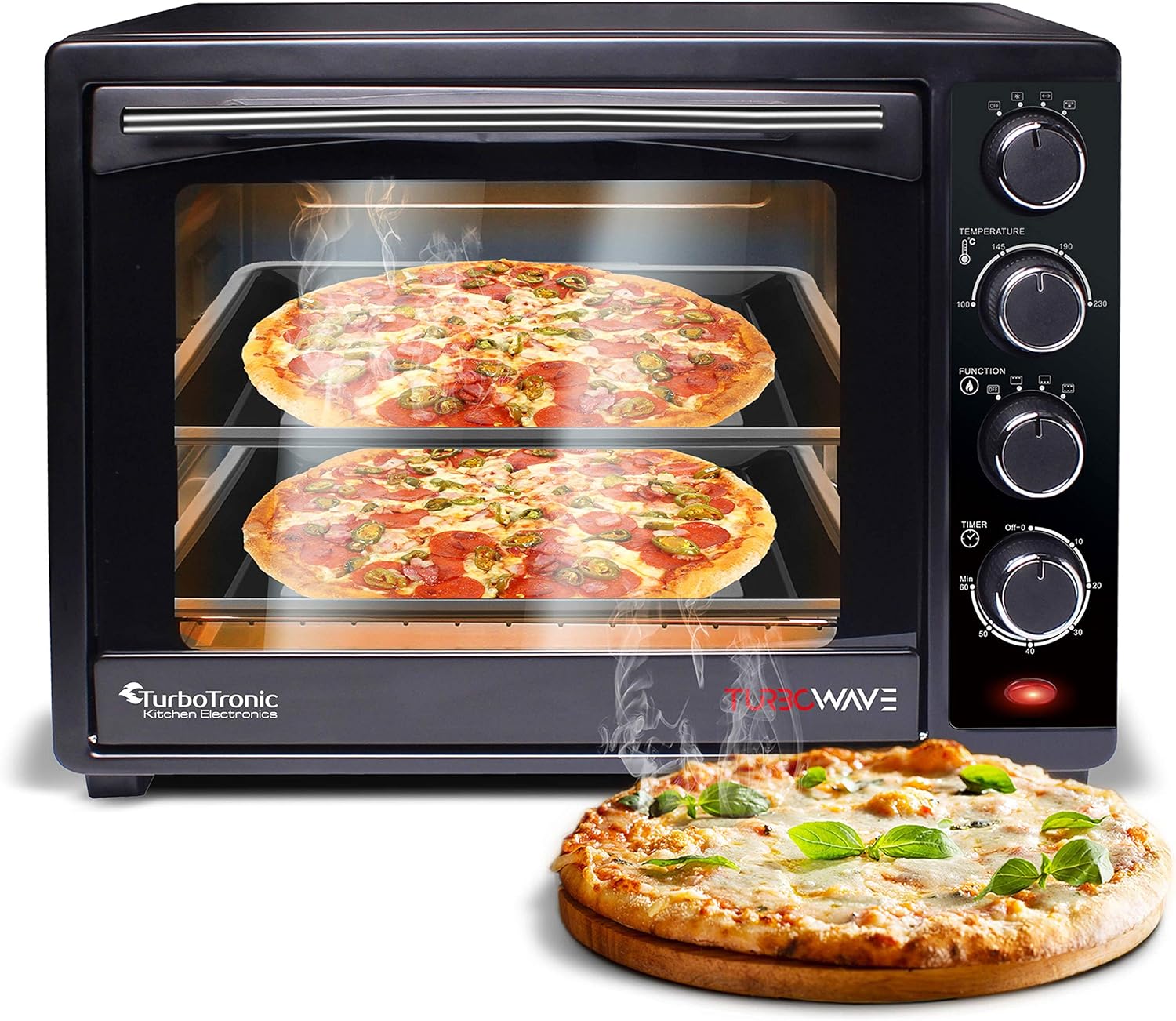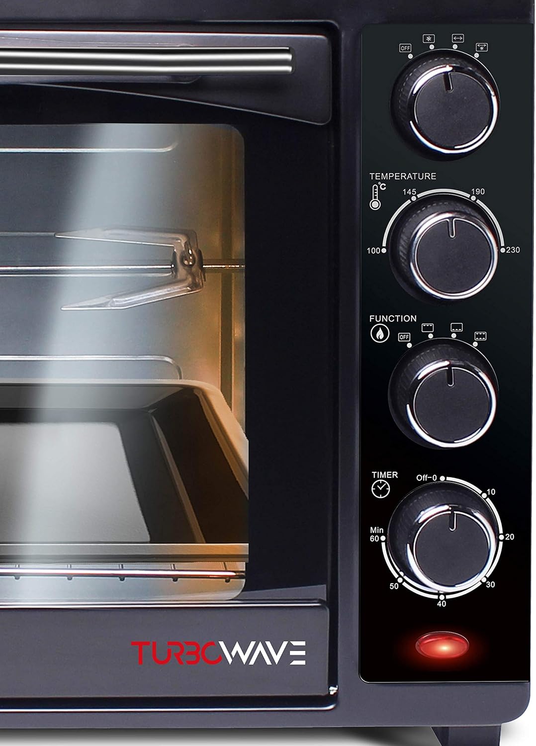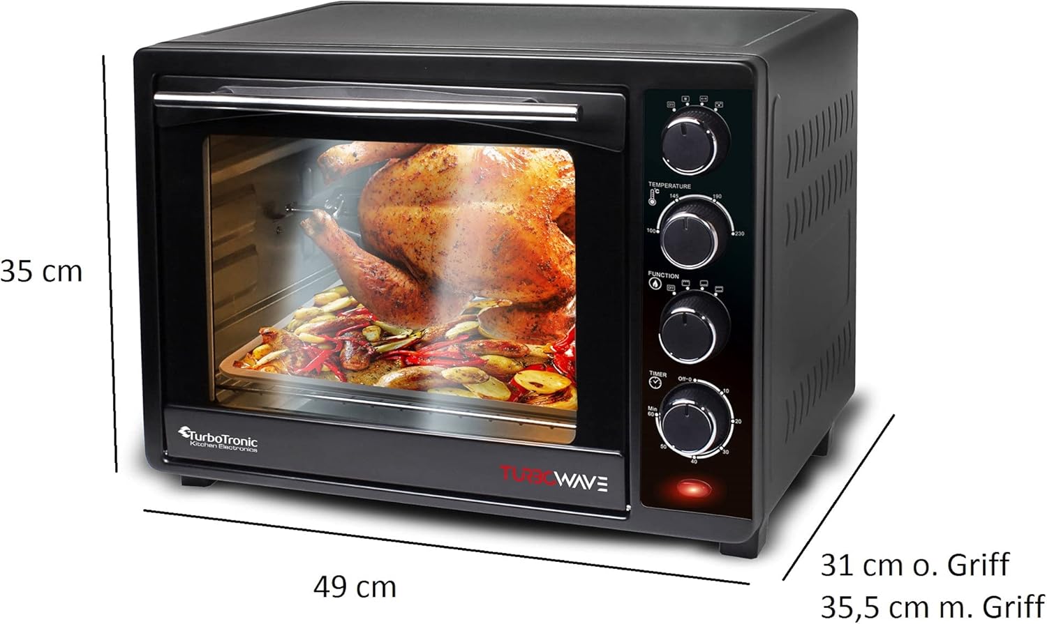 TurboTronic EV35 Electric Mini Oven 35L – Double Glazed Compact Table Top Oven with Timer for Baking, Grilling, Rotisserie, Pizza, Toast and Reheating – Comes with Rotisserie Skewer, Baking Trays