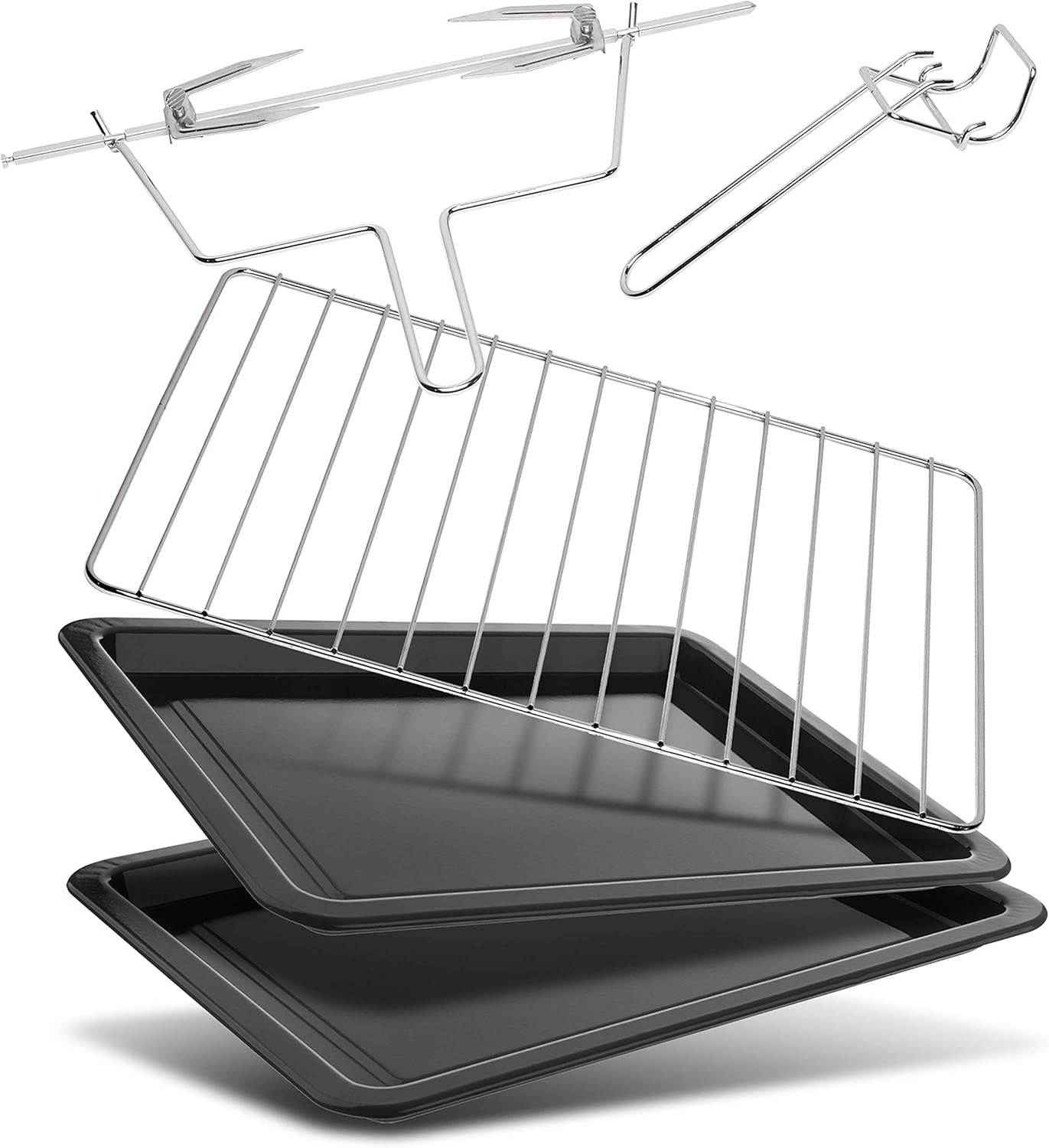 Comes with 1 rotisserie set, 2 non-stick baking trays and 1 stainless steel grid, all dishwasher safe.