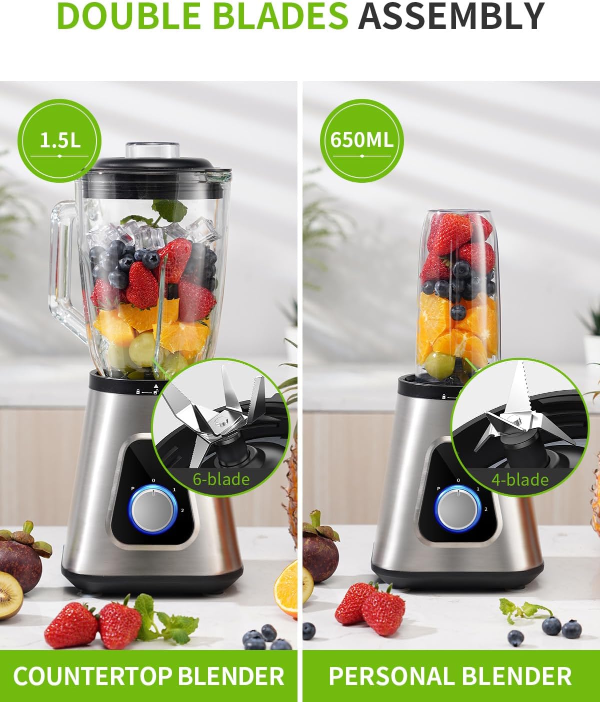 [2-1 Blender Combo]: Versatile design smoothie maker with a 650 ml travel cup and 1.5L glass jar attachments. You can blend directly in the 650 ml cup, attach the spout lid, and enjoy your creations on the go. The blender smoothie maker is great for individual and family use.