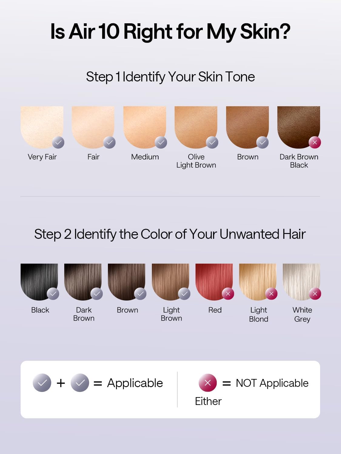 IPL hair removal technology is not universally compatible. It’s not suitable for tattooed and over-tanned skin, wounded areas, and pregnant. Please refer to the skin tone & hair color chart before use.