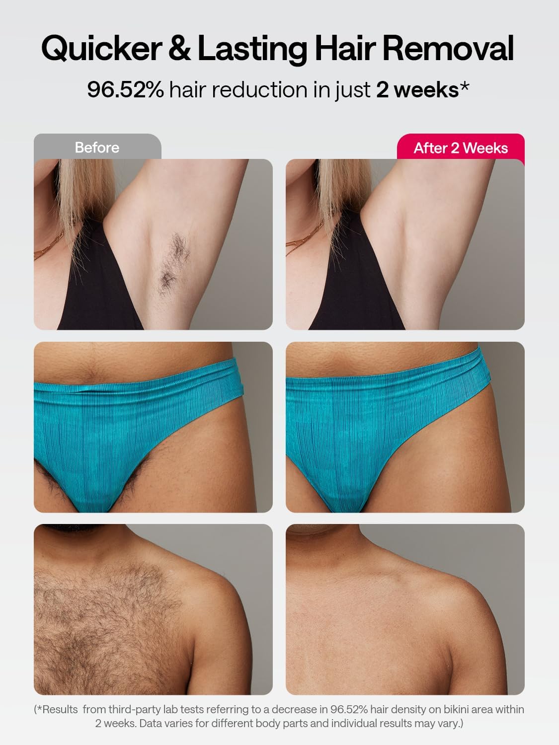 Effective in Just 2 Weeks*: Our hair removal device is equipped with dual lights, providing a wider treatment area and double the light source compared to our previous models. Experience up to 96.52% hair reduction (for the bikini area) in barely 2 weeks* and perform full-body sessions in as quick as 10 mins* with Ulike hair removal device. Individual results may vary.