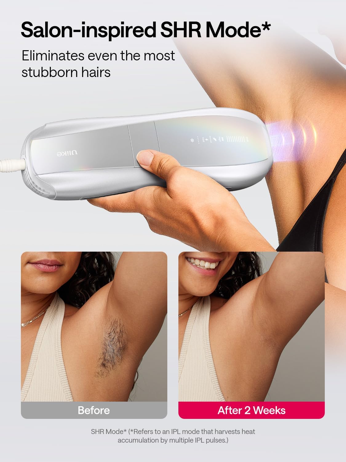 Removes Stubborn Hairs: Salon-inspired SHR Mode* is an advanced IPL treatment that activates both lamps of the IPL hair removal device, delivering a staggering 26J of total energy in 4 pulses per second burst that allows our hair remover for women to erase even the most resilient hairs.
