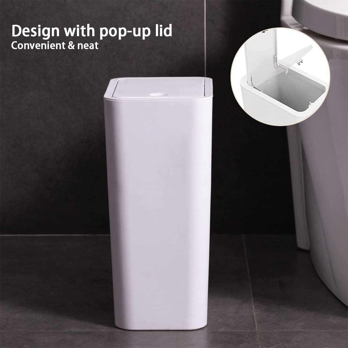 Easy To Use: The pop-up design lid is simple and convenient. Simply tap the button to open or closed the lid. The plastic ring can fix the garbage bag and prevent the garbage bag from slipping away.