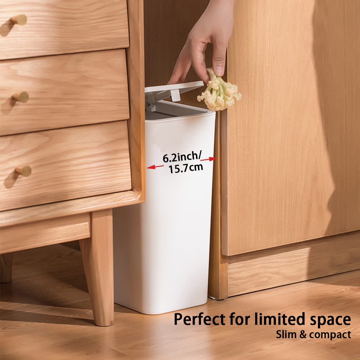 Save Floor Space: This rectangular Garbage can is the perfect size for storing inside cabinets, underneath counters, under sinks and other small nooks and spaces in your bathroom; This plastic garbage can is quite slim and narrow for its volume. It has a small footprint, so it can be placed or hidden in almost any place.