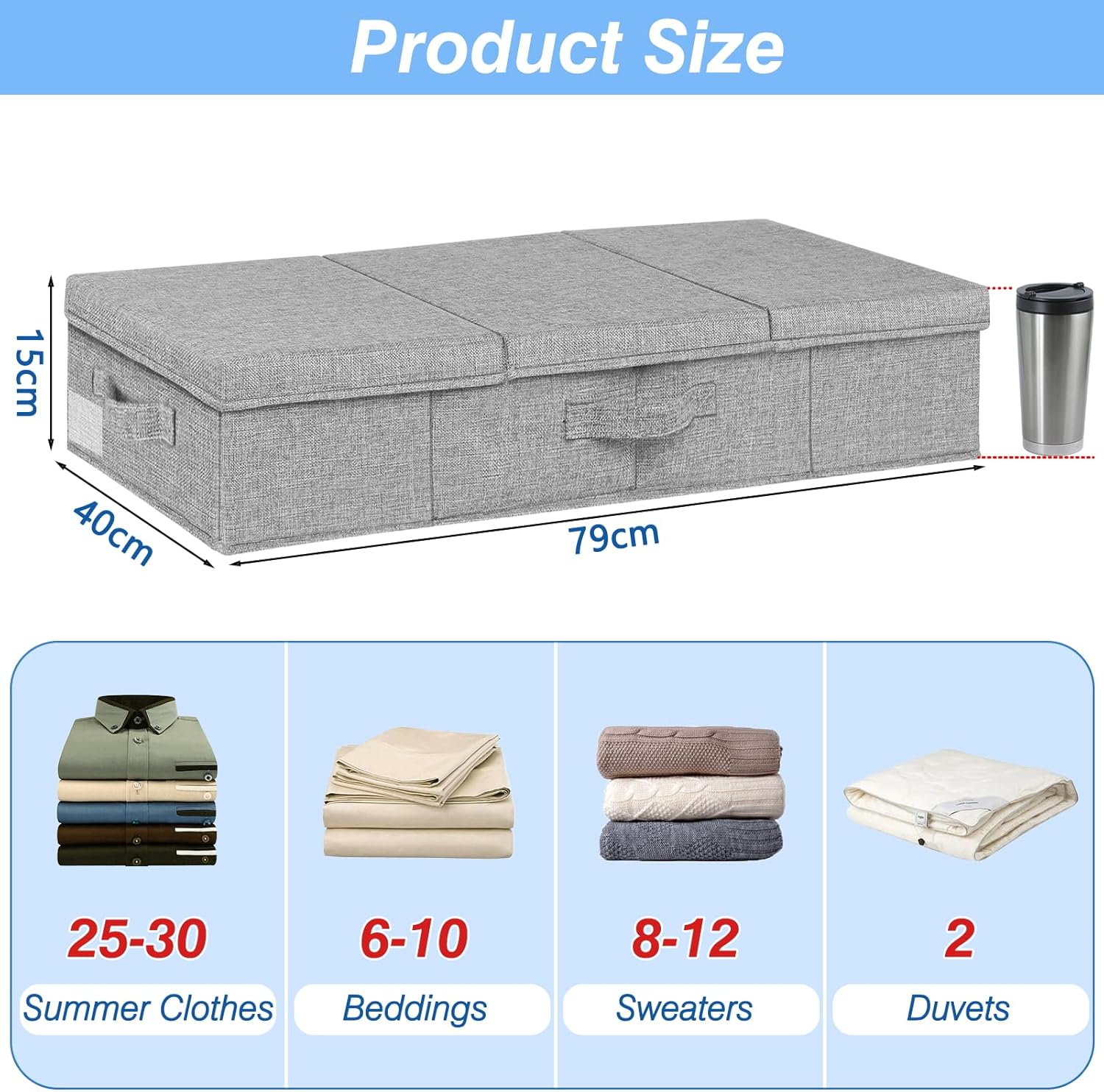When you declutter your home with these under bed clothes storage, you enhance your life. Not only does declutter reduce stress and anxiety, but it can also establish a sense of self-accomplishment, foster stronger familial relationships, and allow you to focus on what’s important instead of the mess surrounding you Winter clothes storage, blanket storage Duvet storage, bedding storage Shoes storage, toy storage Any what you want Multiple Scenes Use The Under Bed Storage Organiser is divided into three parts, the cover, the main body, and the bottom plate. The lid can be folded into three sections and you can slide to view the contents inside. When using a large storage box, also it can be folded into a flat shape when not in use to save space Pick One You like Add To Basket Add To Basket Add To Basket Add To Basket Add To Basket Customer Reviews 4.4 out of 5 stars 4.4 out of 5 stars 4.6 out of 5 stars 4.6 out of 5 stars 4.4 out of 5 stars Price £28.25£28.25 £28.75£28.75 £39.99£39.99 £40.49£40.49 £27.49£27.49 Size 79 x 40 x 15 cm 79 x 40 x 15 cm 75 x 40 x 22 cm 75 x 40 x 22 cm 76 x 38 x 17 cm Dustproof & Moisture Proof ✔ ✔ ✔ ✔ ✔ Foldable & Stackable ✔ ✔ ✔ ✔ ✔ Storage Places Underbed, Closet, Dorm, etc Underbed, Closet, Dorm, etc Underbed, Closet, Dorm, etc Underbed, Closet, Dorm, etc Underbed, Closet, Dorm, etc Storage Items Clothes, Blankets, Shoes, etc Clothes, Blankets, Shoes, etc Clothes, Blankets, Shoes, etc Clothes, Blankets, Shoes, etc Clothes, Blankets, Shoes, etc Color Grey Black Grey Black Grey With Wheels ✘ ✘ ✔ ✔ ✘ 【LARGE CAPACITY】: The size of each under bed storage box with lid is 79 * 40 * 15 cm. The large capacity is very suitable for storage under the cabinet, under the sofa or under the bed. The large under bed storage can store clothes, bed sheets, toys, shoes, Duvets, Comforters, Blanket, Bedding, daily necessities, etc. Free up room space and keep your room clean and tidy. Customers like the size, quality and versatility of the storage box. They mention that it’s pretty spacious, saves space and is a perfect under bed box. Customers appreciate the ease of assembly and appearance. They say that it’s well designed and a near perfect colour match to their sofa. AI-generated from the text of customer reviews