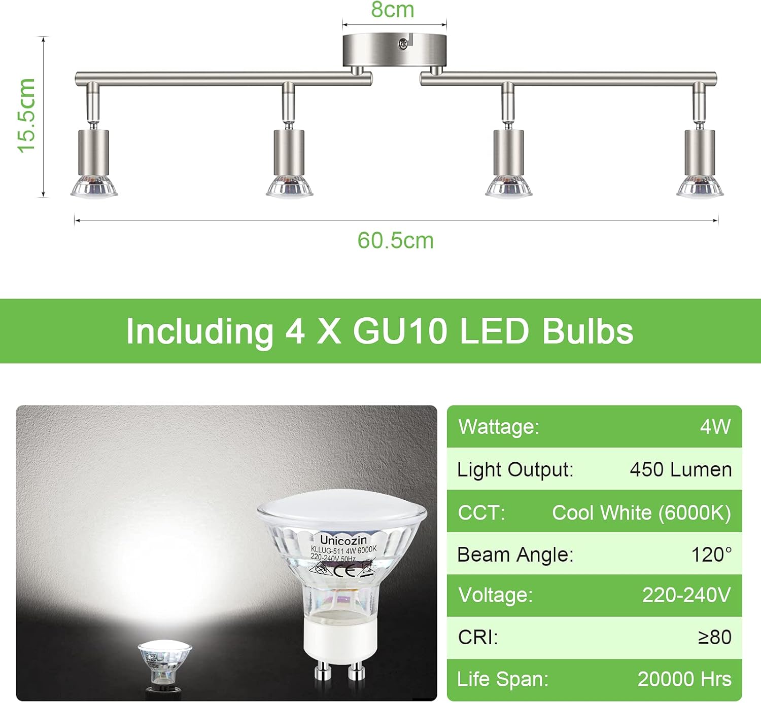 Unicozin LED Ceiling Light Rotatable, 4 Way LED Ceiling Spotlight, Matt Nickel & Swivelling Design, Including 4 X 4W GU10 LED Bulbs (450LM, Cool White 6000K),for Kitchen, Living Room, Bedroom