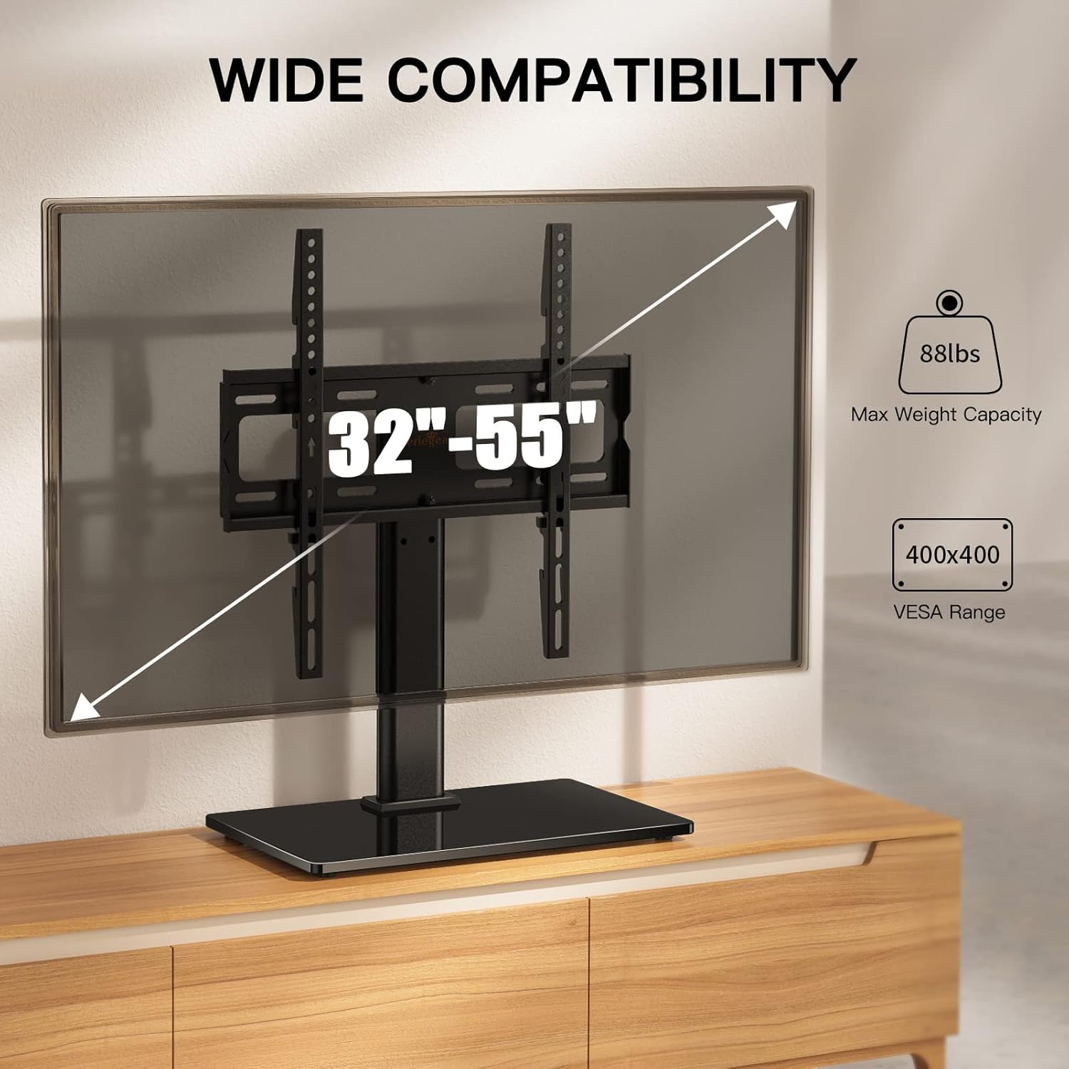 Universal Swivel TV Stand – Table Top TV Stand for 32-60 inch LCD LED TVs – Height Adjustable TV Base Stand with Tempered Glass Base & Wire Management, Holds 40 KG & Max.VESA 400x400mm