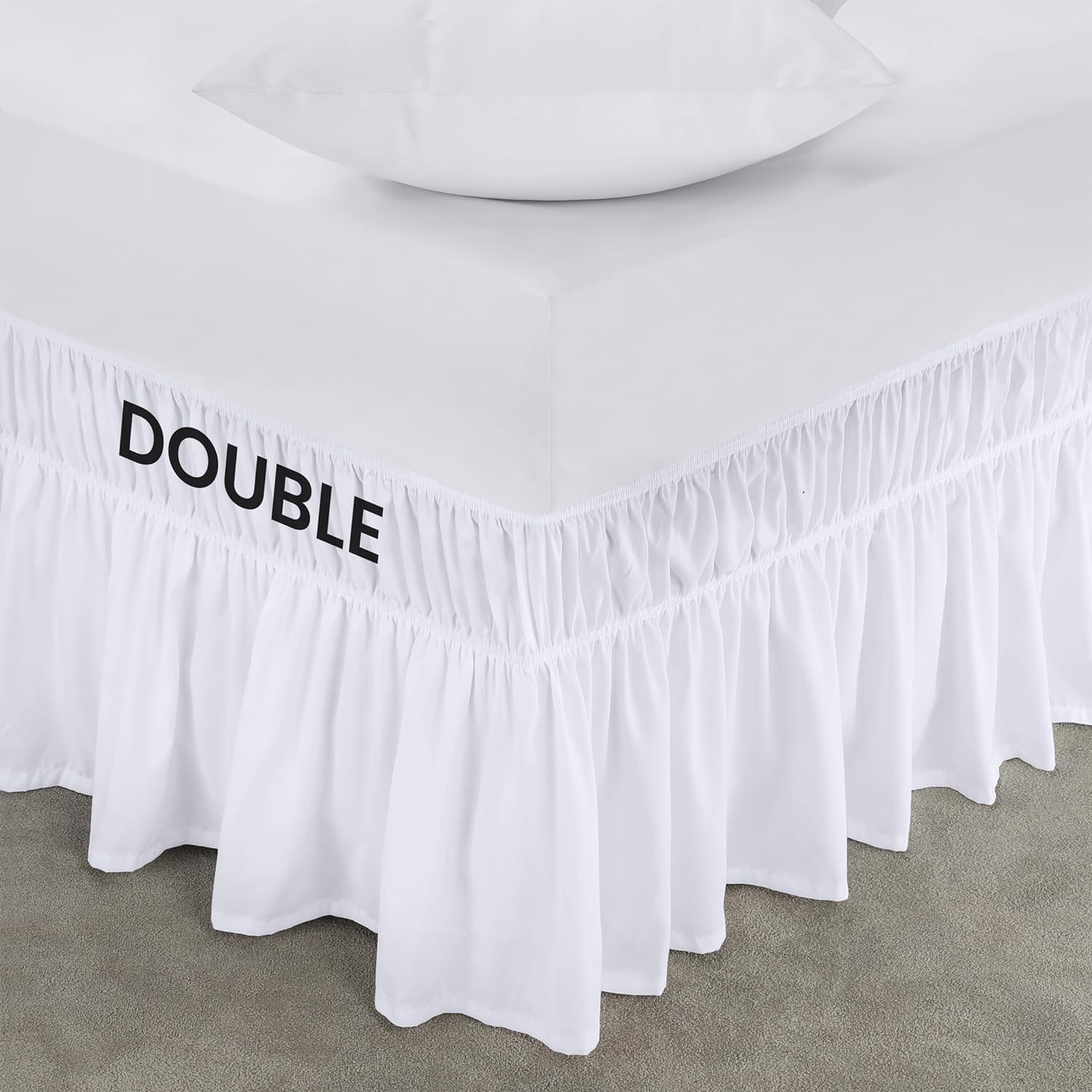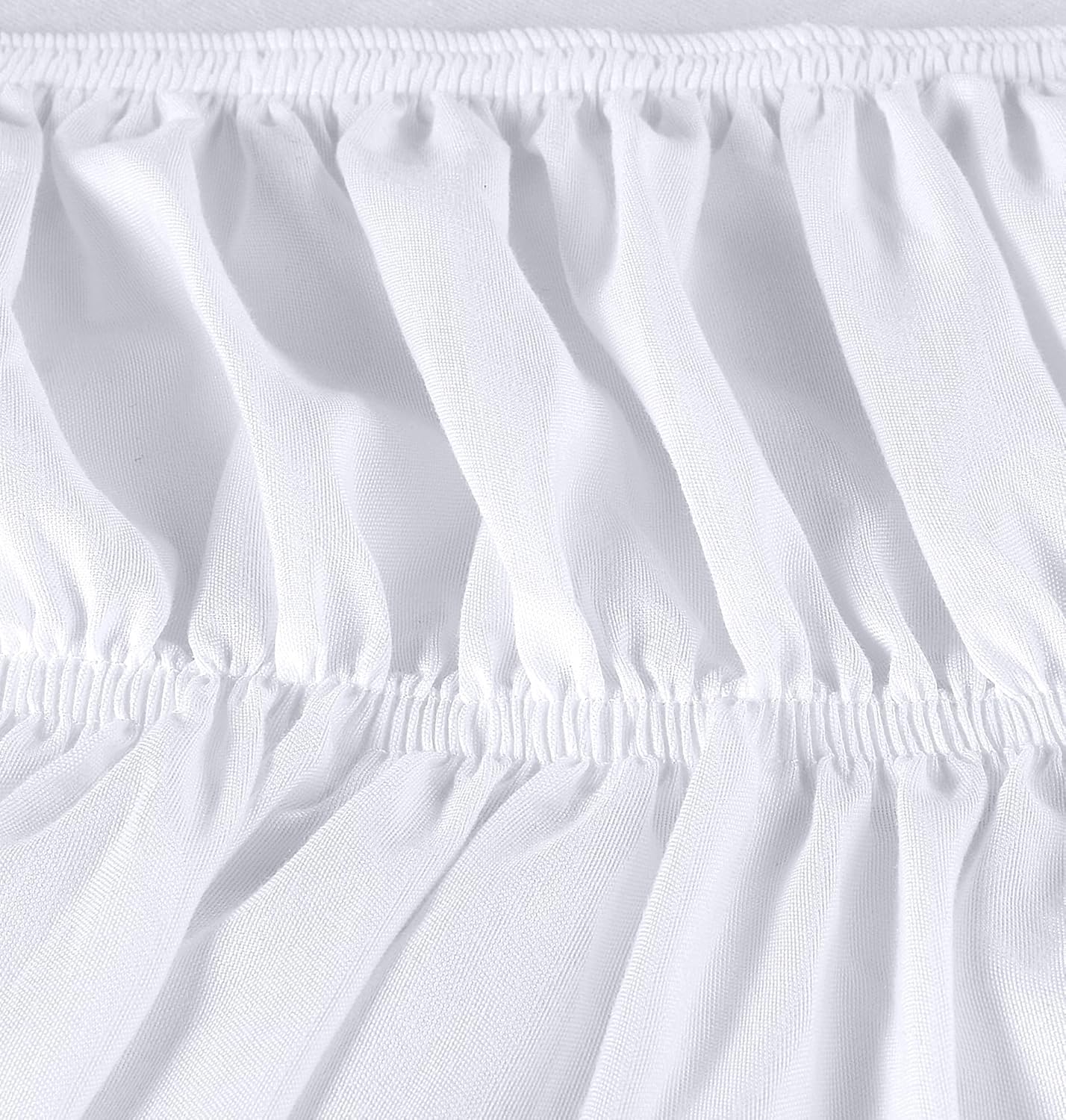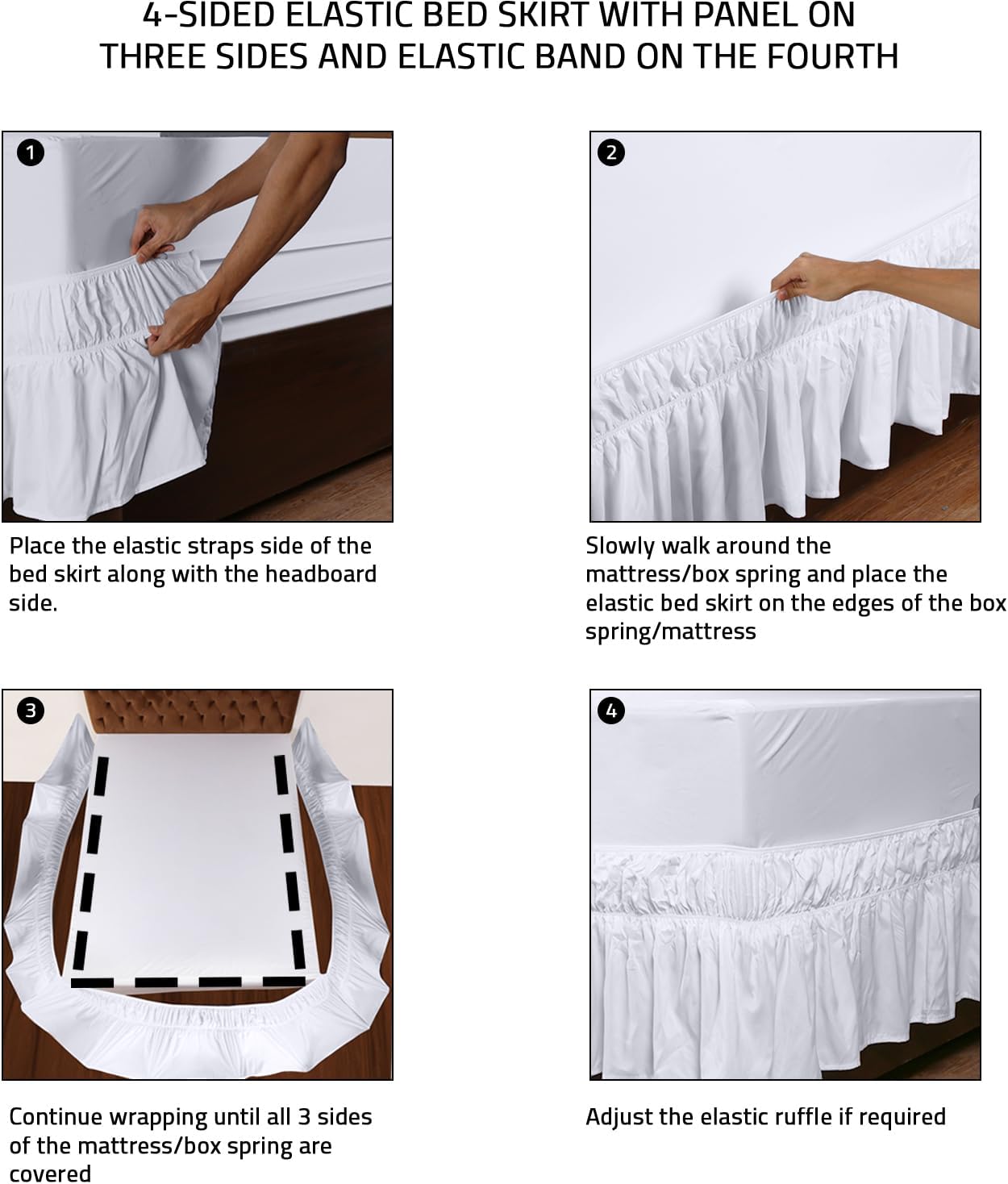 Effortless Elastic Bed Ruffle: This new design of elastic bed ruffle has three sided wrap around skirt with no top fabric to save you from lifting off your mattress to install. Easy to put it on and take it off. This elastic bed skirt makes your life easy!