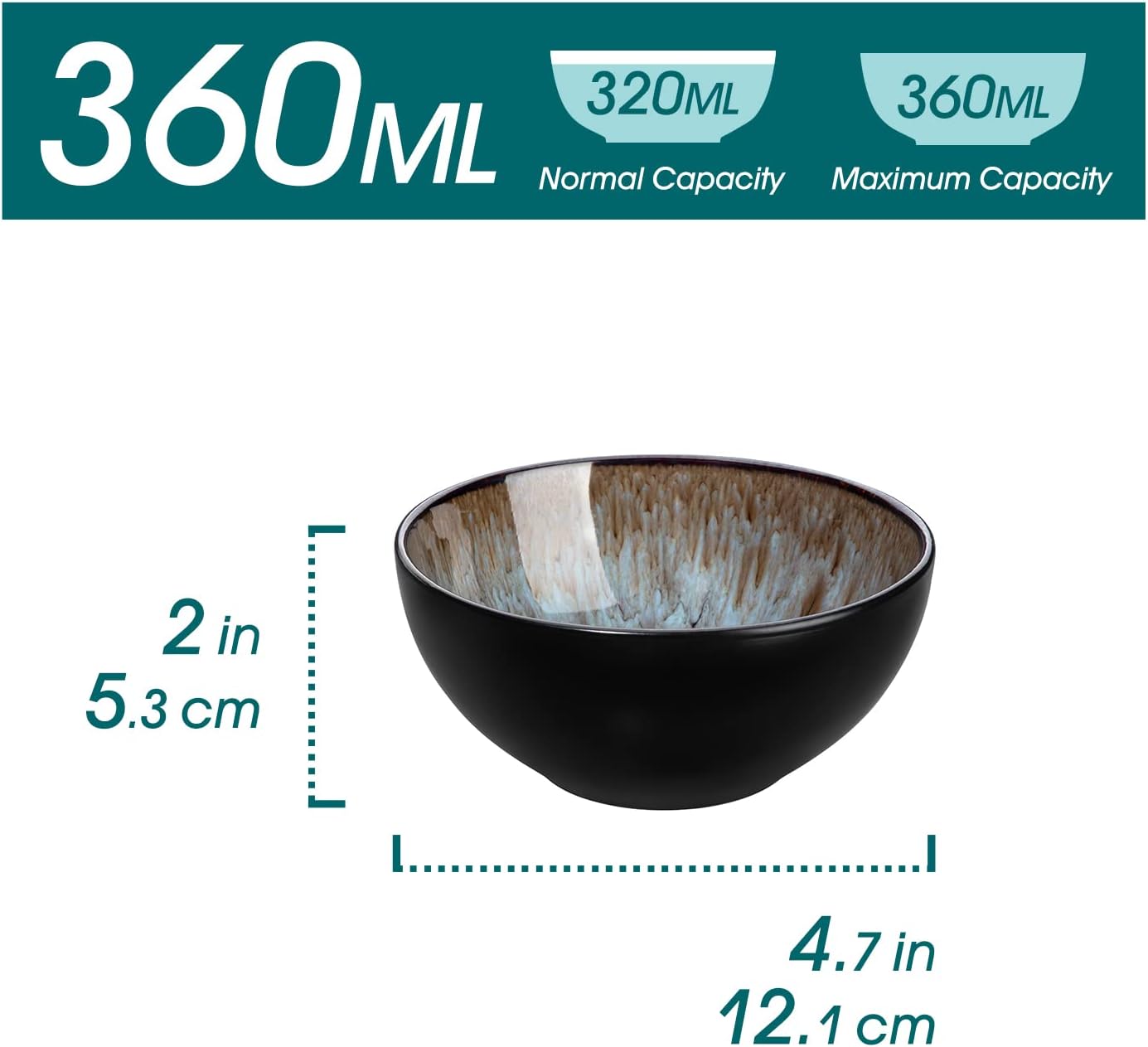 Diameter 12.1cm, deep 5.3cm, 360ml. These bowls are so cute and handy to hold. The size is good for dieters and children. Widely used for cereal, porridge, snack and breakfast.