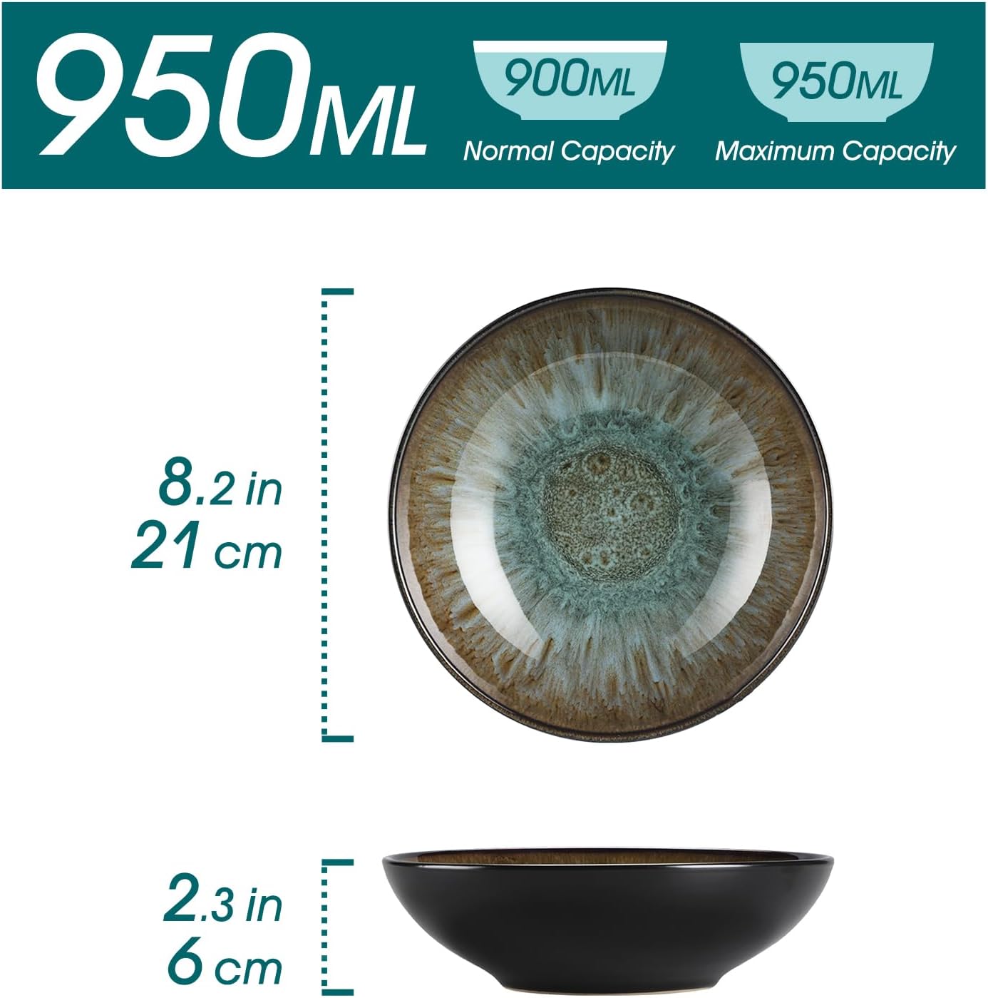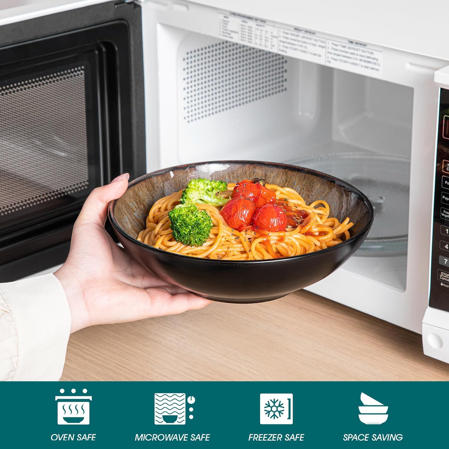 【Big Capacity of 950ml】Diameter 21cm, deep 6cm, 32oz. These pasta bowls very wide and deep, enough for ramen, soup, pasta, cereal, salad and breakfast. The bowls feel strong but not too thick, can survive multiple cycles of the dishwasher, heating in microwave and daily use.